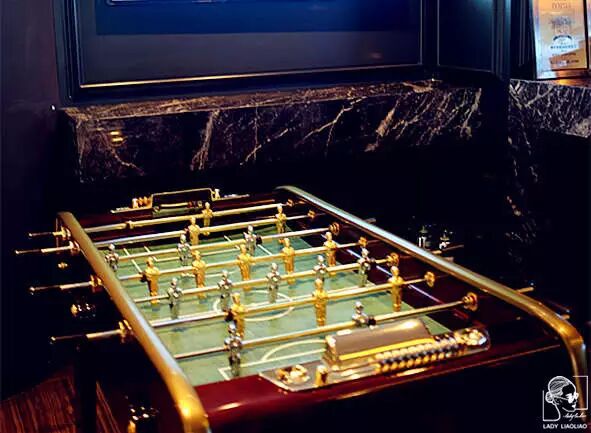 ▲进入餐厅前会经过酒吧区,暖黄色的灯光柔和了大理石吧台的生硬。桌上足球机是品牌人性化服务最好体现,当熊孩子们闲不住时这简直是拯救大人的神器。