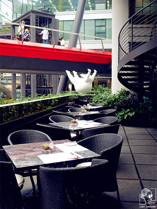 ▲Alfie’s Beijing阳台位于购物中心的三层视野广阔,除了芳草地的各种艺术品。红色天桥上来来往往的人也是不错的风景。