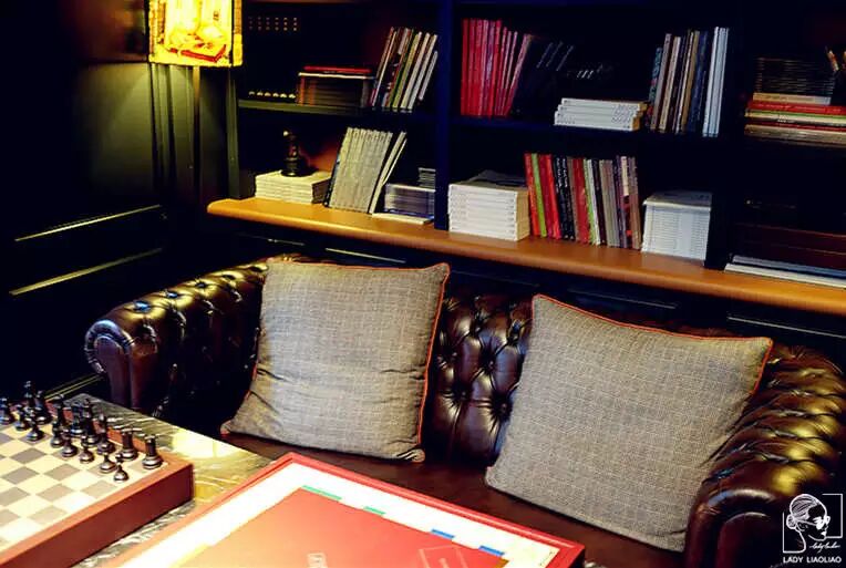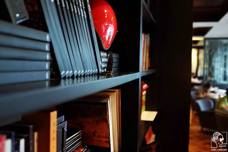 ▲酒吧和餐厅间设有贴心区域,书房般的“图书馆”。等待迟到的朋友时,不妨取阅一本。
