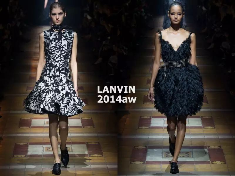 戴着宽檐帽的Lanvin女人是菲茨杰拉德手下的黄金时代女郎,而事实上这场秀的风格并非纯粹的30年代,(鹳羽蓬蓬裙和流苏夹克并不属于那个时代)。每个女人都爱裙子,每个女人也都穿裙子,对,穿Lanvin的女人与众不同。。