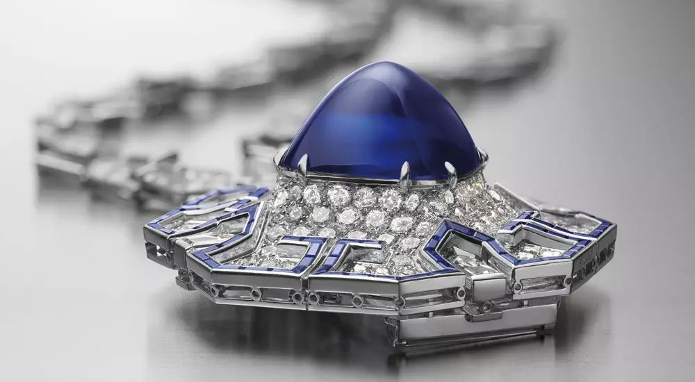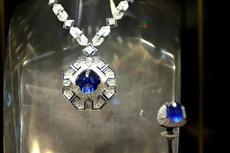 是中央镶嵌一颗重达65克拉的塔糖型单面切割缅甸蓝宝石,周围以钻石和蓝宝石铺镶衬托。
