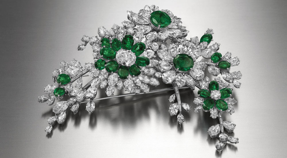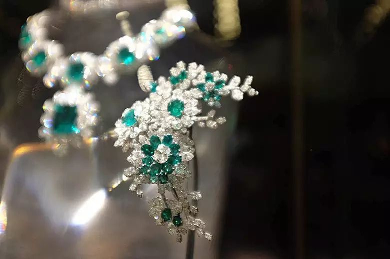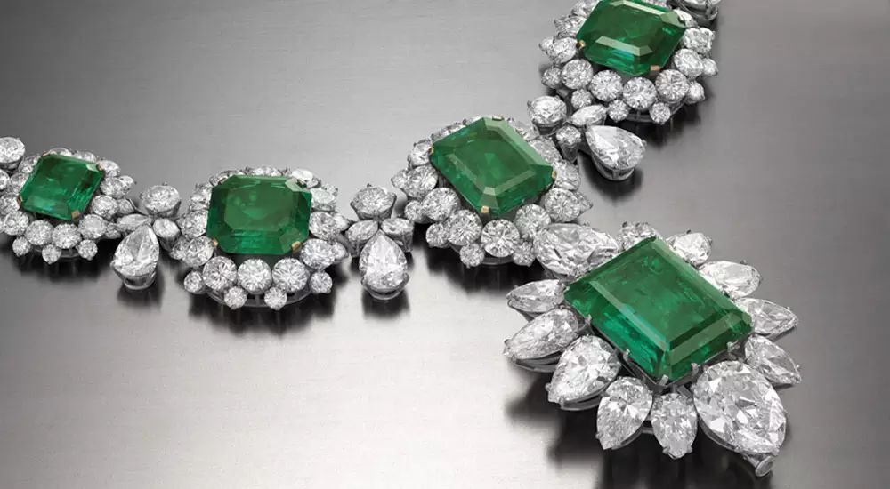 这条项链镶嵌16颗八角形阶梯切割哥伦比亚祖母绿,总重约达60.5克拉,中央部分可连接胸针作为吊坠。