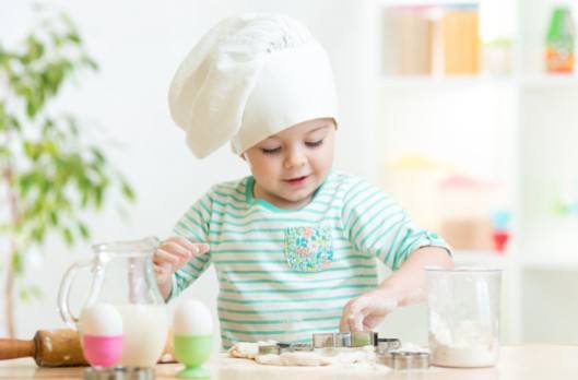 4~6岁:这个阶段的孩子可以进一步参与食物制作并使用一些真正的厨具,混合搅拌食材、剥桔子皮/葡萄皮/煮熟的鸡蛋皮、 用儿童剪刀剪蔬菜、裱花带装饰食物、给烤盘抹油、量取食物、开关料理机等。不过很多操作还是需要在大人帮助下,并且一定要注意远离热的灶台炊具。