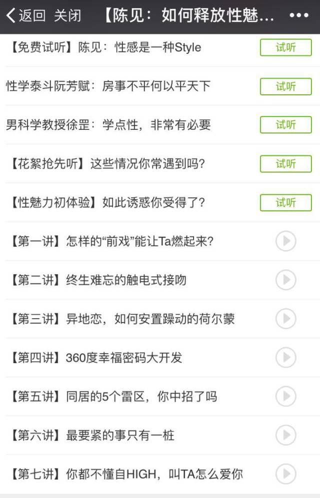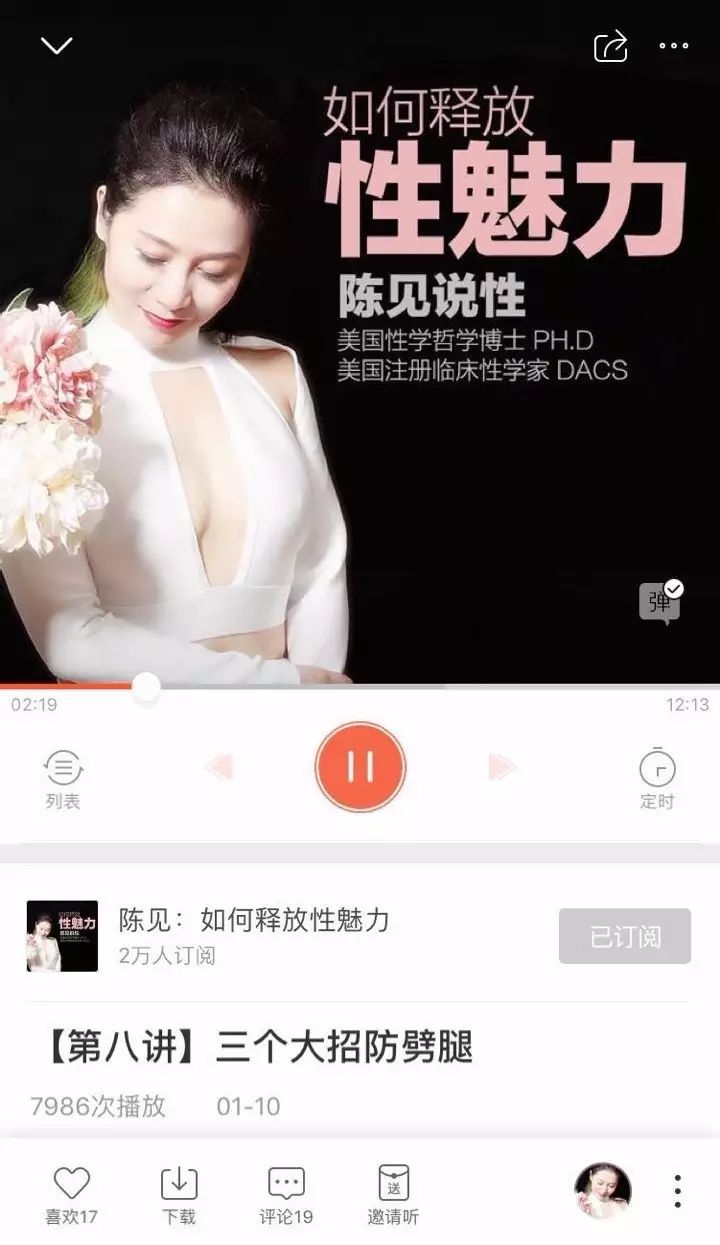 ▲《陈见:如何释放性魅力》音频专辑共包含12堂课程 5集免费试听,每周四定时更新,现已经更新至第8集,欢迎收听。