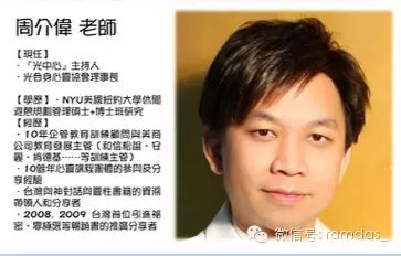 台湾最知名的新心灵观念的分享推广者之一,台湾光中心创办人,十余年新时代思想推广分享经验,擅长已幽默和显浅易懂的分享新心灵思想精华给大众,是位热情而温暖的光明天使。