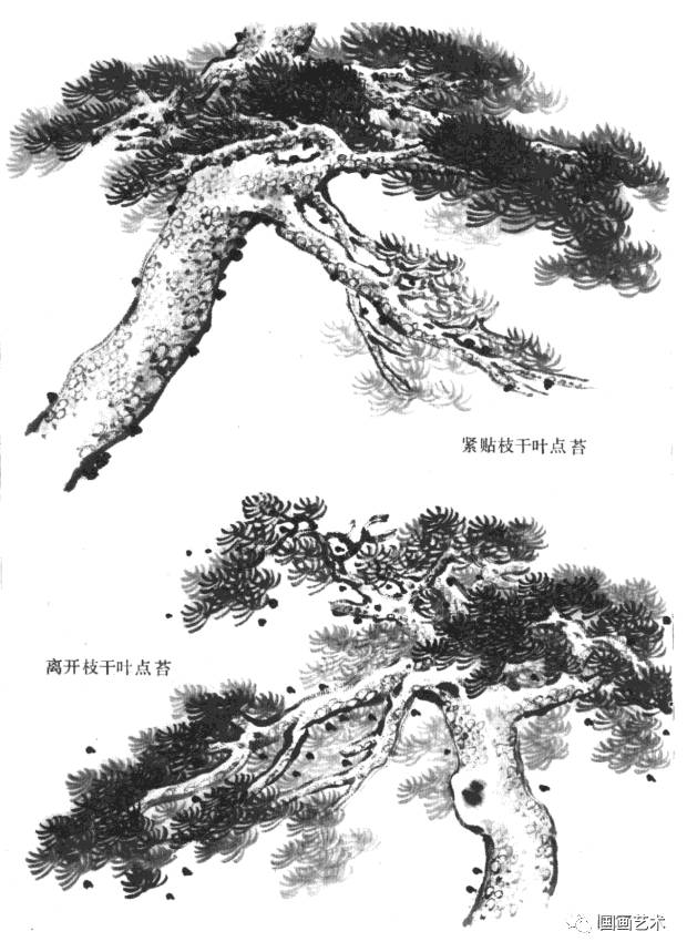 水墨画松的步骤为:先以墨笔勾画出枝干与其间的节窟,顺势勾画松根,紧接着圈点松鳞并施水墨擦染,再勾剔松针,最后点苔完成,若染颜色,应在用水墨全部画完之兵力。