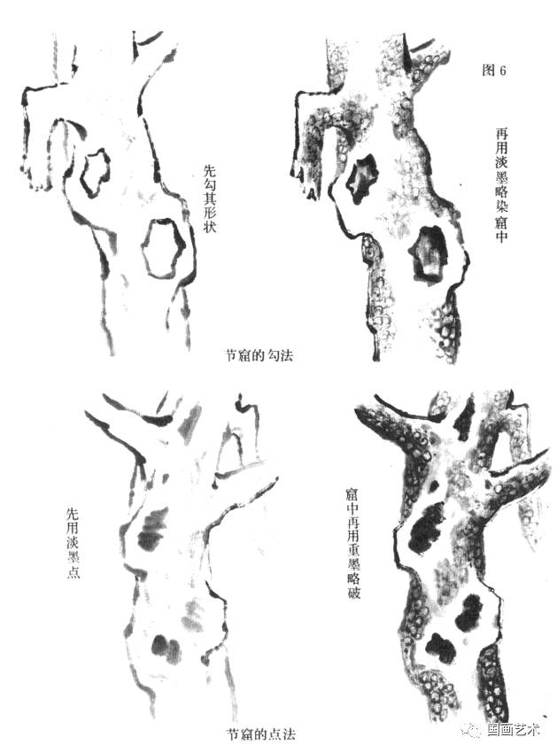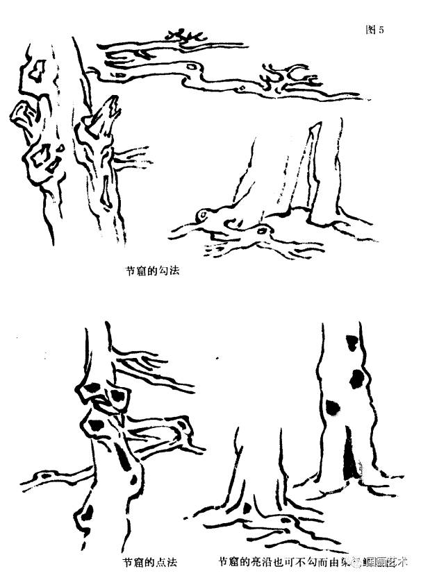 (二)松树节窟的画法松树节窟应随勾枝干的过程而顺手勾点,形状可近圆或近方。画法有两类,一类是先勾出节窟内沿的形状,然后以墨色填染,工细画松多用些法;另一类是直接用墨色点画出节窟的内状,然后通过皴、染而空出窟沿的手法,来表现它外凸内凹的感觉。