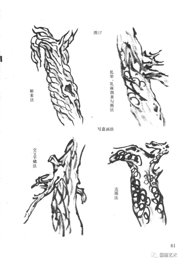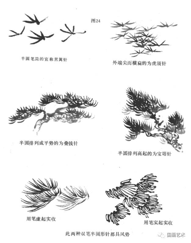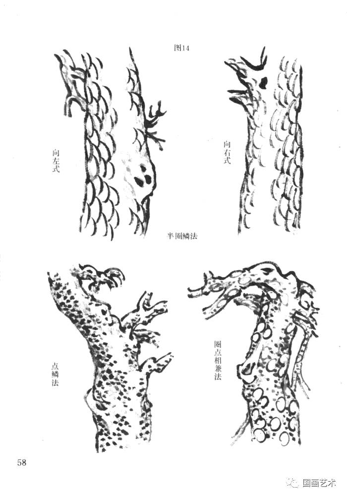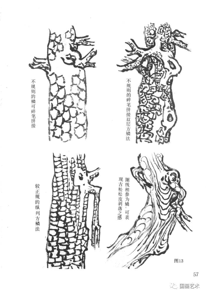 (四)松皮的画法松鳞的具体勾画方法,可概括为圈法与点法两大类,但因绘画形式和各家的表现手法而不同,所呈现出的具体画法也是丰富多变的。如圈鳞法,就有单圈、双圈(圈中勾圈)和变体的半圈、方勾以及写实性很强的鳞爆明显的双圈兼擦染等方法。点鳞法,亦有点斫与涂抹等各种不同的方法,其中圈点二法常常结合使用。