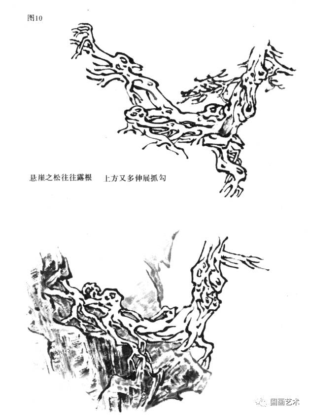 (三)松根的画法画松露根,多用在山水画中对崖间或流水道边的松树描画,而只作干、枝、叶特写的画松中一般不画根。松根应当以坚劲挺拔的中锋写出为宜。