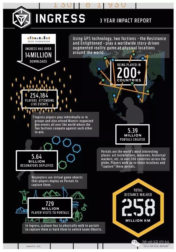 根据Niantic官方公布的数据,游戏上线三年后,在全球已经有超过1400万次的下载,玩家遍布200多个国家和地区,游戏的在线活动的参与人数达25万人次,玩家们共在游戏当中创建了539万个传送门,部署了56.4亿个共振器,到达真实世界当中的7.29亿个地点,总共走过的路程超过2.58亿公里,游戏可以说取得了巨大的成功。