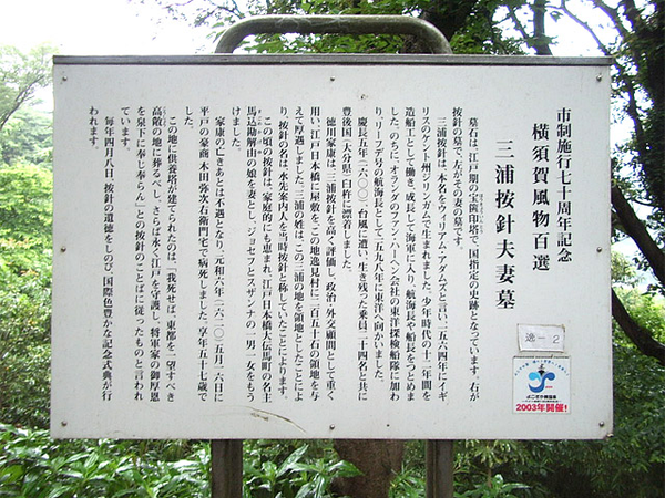 “安针冢”站;在大分县臼杵市,当年亚当斯上岸的地方,设有“三浦按针上陆纪念碑”及“三浦按针纪念公园”;在静冈县伊东市,当年亚当斯造船的地方,也有按针纪念公园和按针铜像。
