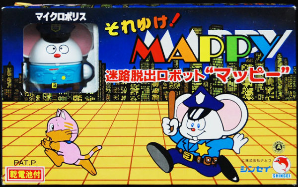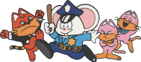 南梦宫在做这个老鼠机器人的时候,就把角色设定为警察,对mappo又做了一次尾音处理,变成了Mappy。而游戏则沿用了机器人的设定,保留了Mappy的名字。也就是说,这个游戏标题翻译成中文,最准的说法应该是——“条子”或者“条杂”。