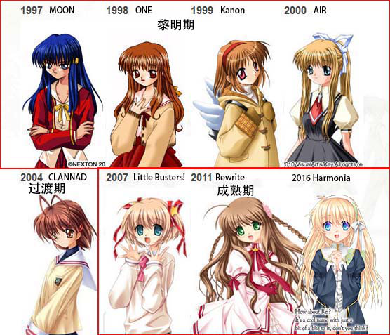 至《AIR》时期画风虽感觉上跟《Kanon》没有变化多少,但《AIR》的角色体型更加纤细,开始有往正常比例方向发展,上色技巧与对光影的掌握也更加熟练。