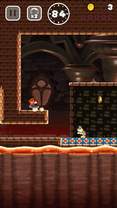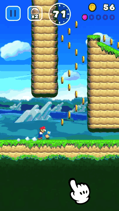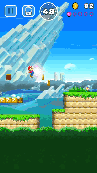 顾名思义,《超级马里奥Run》是一款跑酷游戏。马里奥将自动向前奔跑,玩家只需要操纵其跳跃避开危险和获取金币,点击屏幕马里奥即可跳起,持续按住会进行大跳跃,跳跃过程中持续点击则可以实现旋转跳跃。