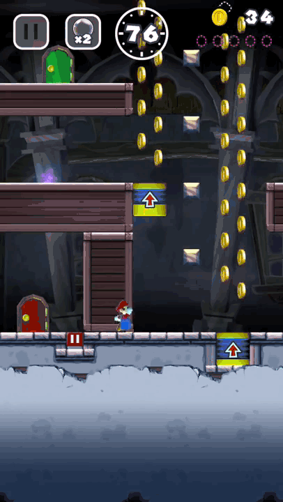 关卡方面,任天堂设计了很多机关,暂停砖块、一直向上的跳台、能把马里奥像大炮一样发射出去的装置等,马里奥世界中常见的各种元素和怪物也都会出现。每个关卡都有时间限制,玩家除了通关之外还可以收集途中的紫色或者粉红色金币,如果在一个单人关卡中收集