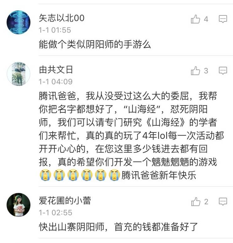 同时,在经常被吐槽山寨的“腾讯游戏”官方微博下,也上演了一幕堪称戏剧的奇景:一群《阴阳师》的玩家向腾讯请愿,希望其能做一款类似《阴阳师》的游戏,背后则饱含着对网易运营的怨气。