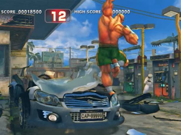 Fighter)的缩写,车牌是“卡普空(CAP)99999”,场景也从海边变成了加油站。和上面快打旋风的图比较一下,不难发现两个加油站的布局、构图都非常像。看来在《超级街霸4》中,角色们洗心革面,专心砸反派的车,并不是像2代那样拿豪车练手。