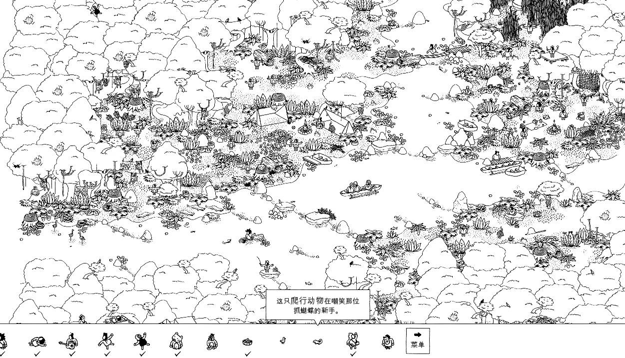 顺利来到第二关,密密麻麻的热带雨林,散布其中的猴子和探险队。你的任务之一,是在这片林子中找到一只小小的变色龙。虽然有点麻烦,但可以接受。