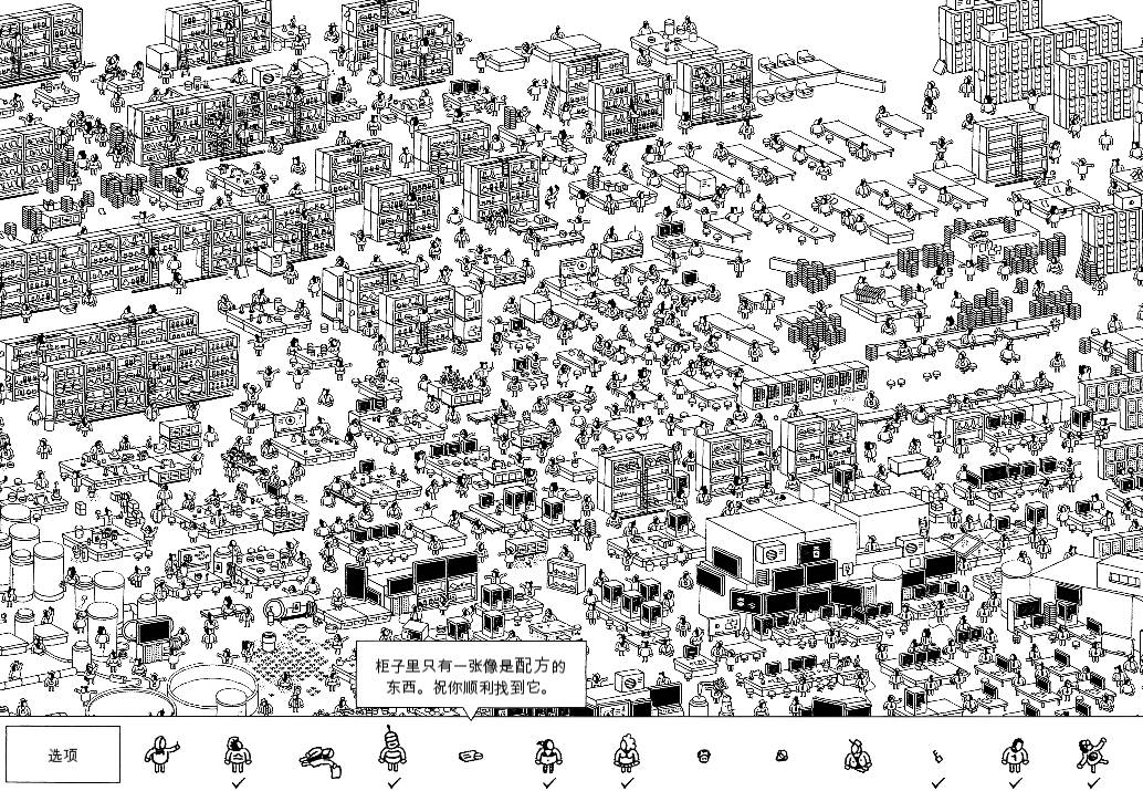 游戏的主要内容就是在黑白手绘的画面中找到指定人物或物品,类似曾经流行的《大家来找茬》,只是难度比后者要高上几个层级。