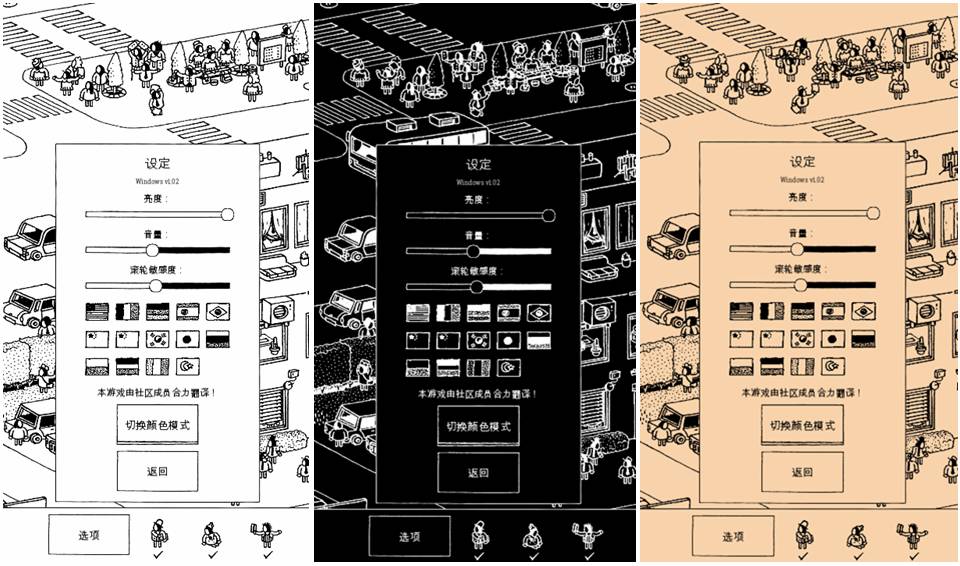 为了避免用户在游玩的过程中用眼过度,作者在游戏加入了三种模式:最普通的黑白,夜间可用的反色,以及不那么刺眼的淡黄色。