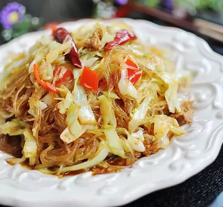 4.当变软出水时,下粉丝翻炒,放盐,让粉丝充分吸收炒出的水分;