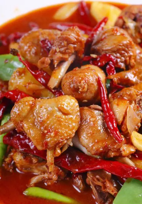 4.大火烧热油,放入姜、蒜片爆香,放入辣椒花椒,放入炸好的鸡块翻炒,撒入鸡精白糖和葱段炒匀。