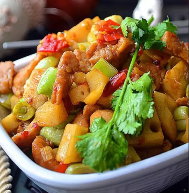 原料:莲藕1节 火腿100克 青红椒各1根 豆腐干4块调料:老干妈辣酱2汤匙(30ml)酱油1汤匙(15ml)盐1/2茶匙(3克)