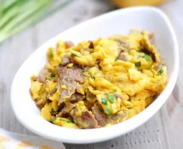 4)炒锅洗净后,再次倒入油,大火加热至9成热时,倒入葱花和红辣椒碎后,马上倒入盛有牛柳片的鸡蛋液。用铲子不断画圈搅拌,待鸡蛋凝固后,调入醋,糖和鸡精,翻炒均匀后即可关火。
