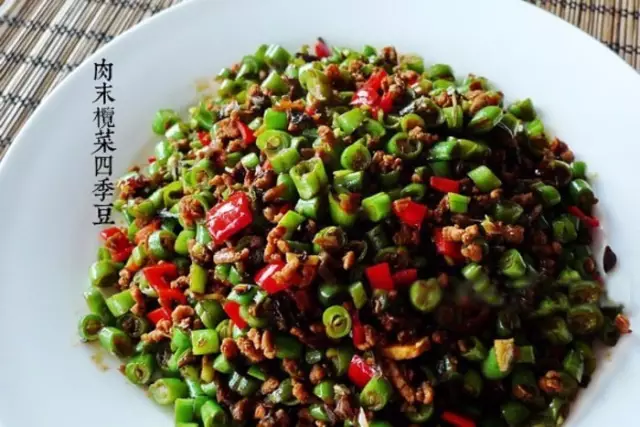 4、起油锅,下蒜蓉爆香后把刀豆粒煸至皱皮,最后放入榄菜肉末拌匀,调味后煸炒即可。