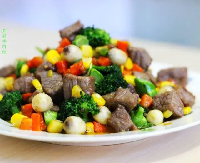 3)炒锅中倒入油,待7成热时,放入干辣椒和姜片爆香,然后放入牛肉粒翻炒2分钟,脱生后倒入豌豆和红黄椒丁,再调入蚝油和盐,翻炒几下即可出锅。