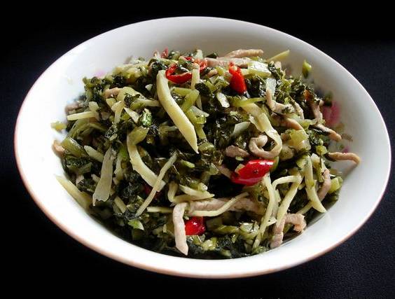 原料:雪菜(雪里蕻)一袋200克 冬笋一个 大葱数片 剁椒2大勺 盐1茶匙(5克) 糖1茶匙(5克) 鸡精少许 香油少许