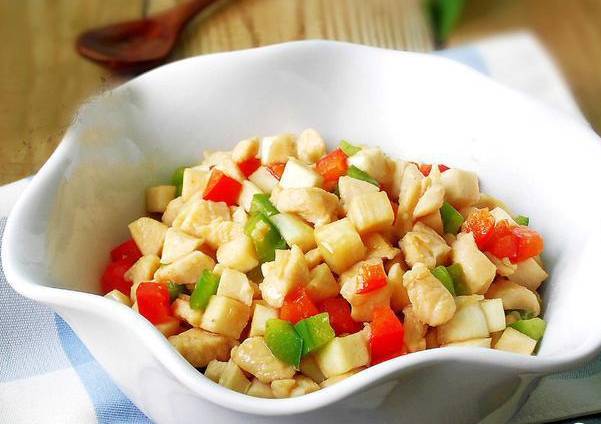 1)青红椒去蒂去籽洗净后切成丁。火腿切丁。豆腐干切丁。莲藕去皮洗净后切丁。