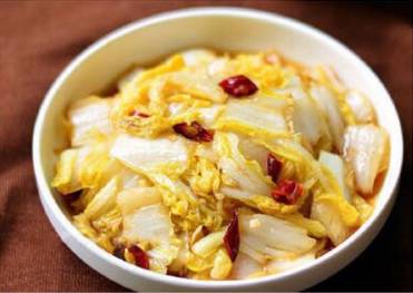 3、烧热锅,放猪油,待油烧至八成热时,将花椒入锅先煸一下取出,再投干辣椒节炸,至辣椒呈褐红色时,放卷心菜,用旺火炒熟后,将料汁倒入炒匀,即可装盆食用。