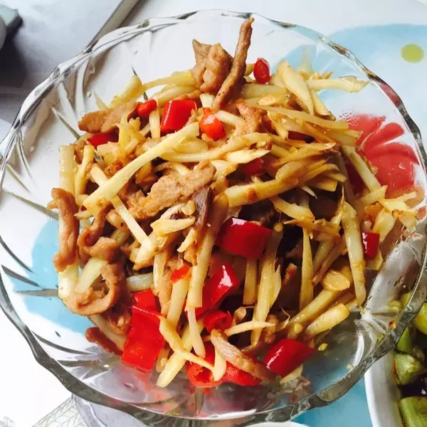 主 料:鲜猪肉二两,仔姜二两,青红椒各一只,大葱取葱白二寸一段