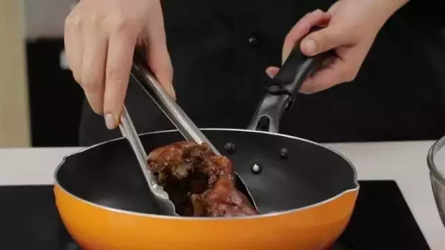 6. 热油入锅,加入去骨的猪蹄,煎至表面金黄。