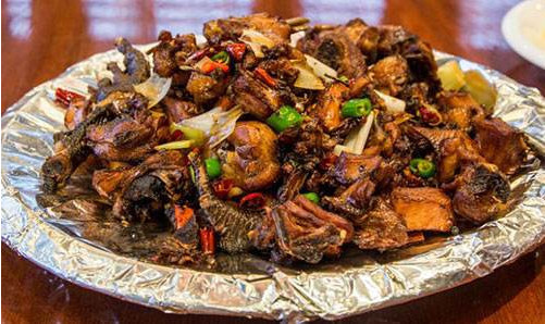 庐山石鸡是一种生长在阴涧岩壁洞穴中的麻皮蛙,又名赤蛙、棘脑蛙,体呈赭色,前肢小,后肢强壮,昼藏石窟,夜出觅食。它的形体与一般青蛙相似,但体大,肉肥,一般体重三四两,大的重约一斤左右。因其肉质鲜嫩,肥美如鸡而得名。
