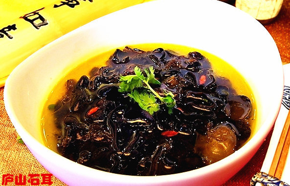 庐山石耳与黑木耳同科,是一种野生在人迹罕至的悬崖峭壁上的菌类植物,由于它形状扁平如人耳,又附着在岩上生长,所以称之为“石耳”。石耳营养价值极高。到庐山如果有幸尝到这一美食的话,一定会回味无穷。