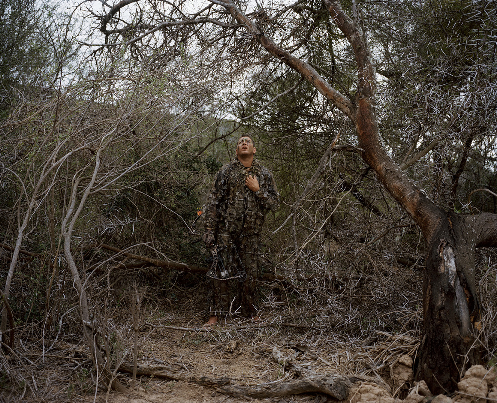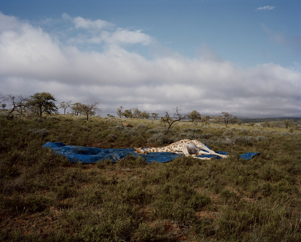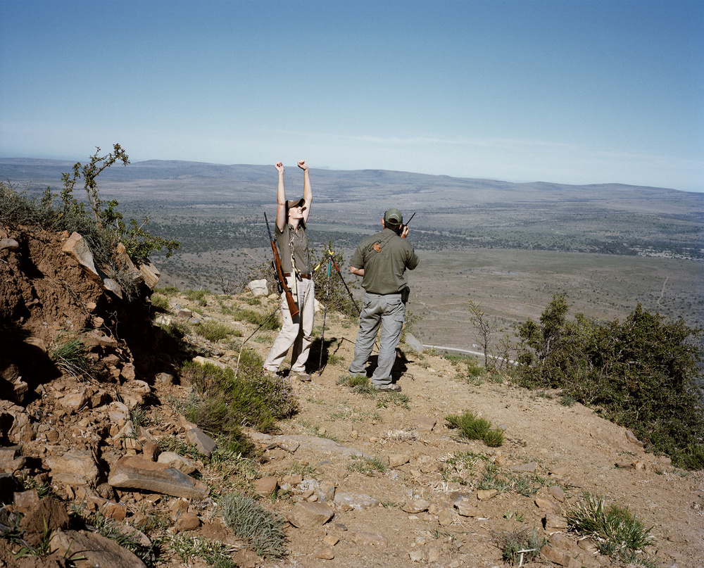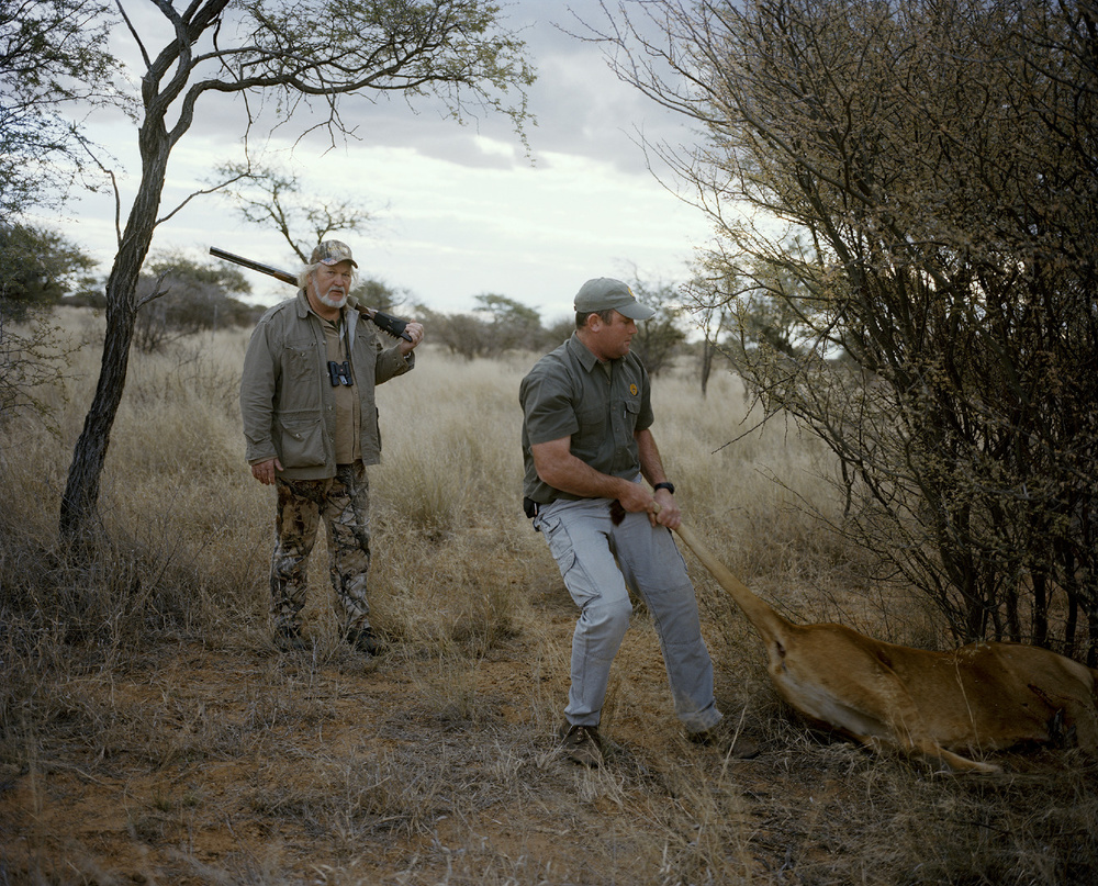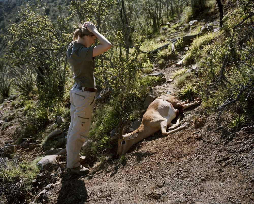 图上为一名女猎人在杀死一只角马后,静静在坐在战利品身边。在杀死动物后,有的人会哭,有的人会激动的庆祝,有的人会祷告,每个猎人都有不同的表现。