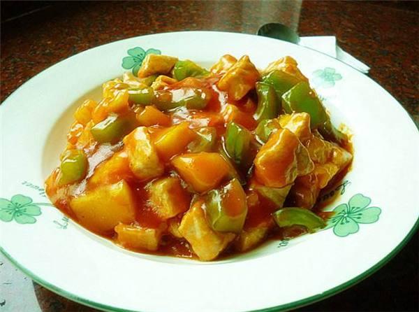 还比如说酸甜咕噜肉,也是为了迎合外国人,中国厨师发明的中国菜,中国人根本就没听说过,它的用料是沙拉、青椒、菠萝、胡萝卜,你们会觉得好吃吗?
