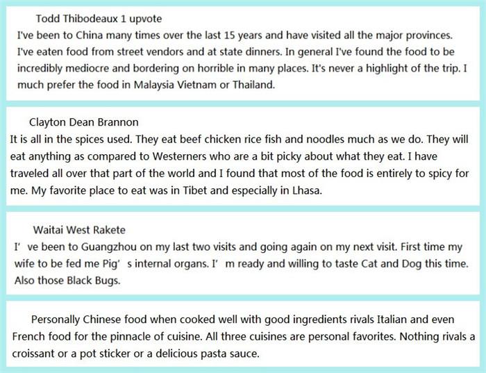 还有一位外国人说:我在中国生活8年,吃过很多好吃的中国菜,但总体来说:中国菜并不是世界上最好吃的美食。(I spent 8 years in China. Had many meals in China;s better restaurants. Chinese food can be very good, but overall it isnt the best in the world.)