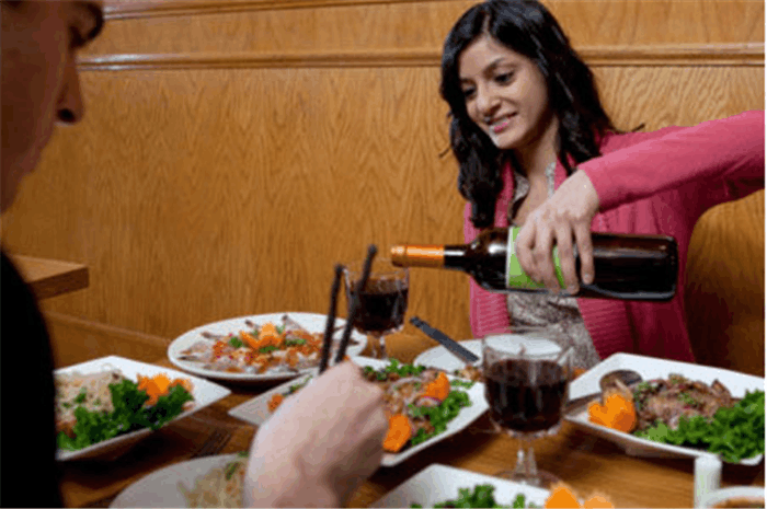 吃中餐喝红酒的外国人