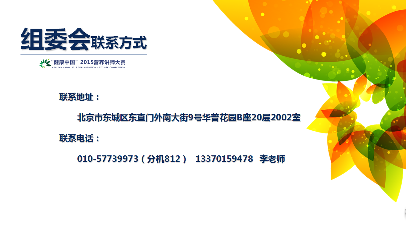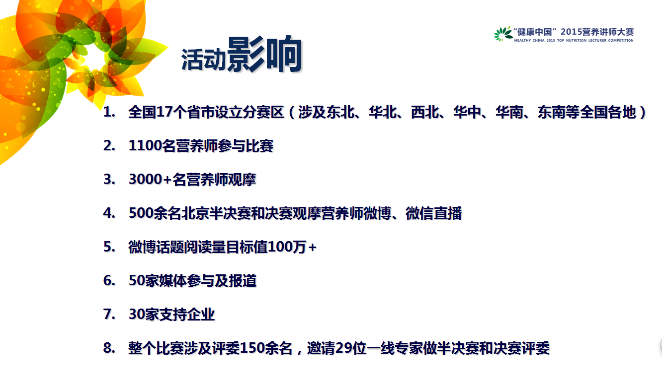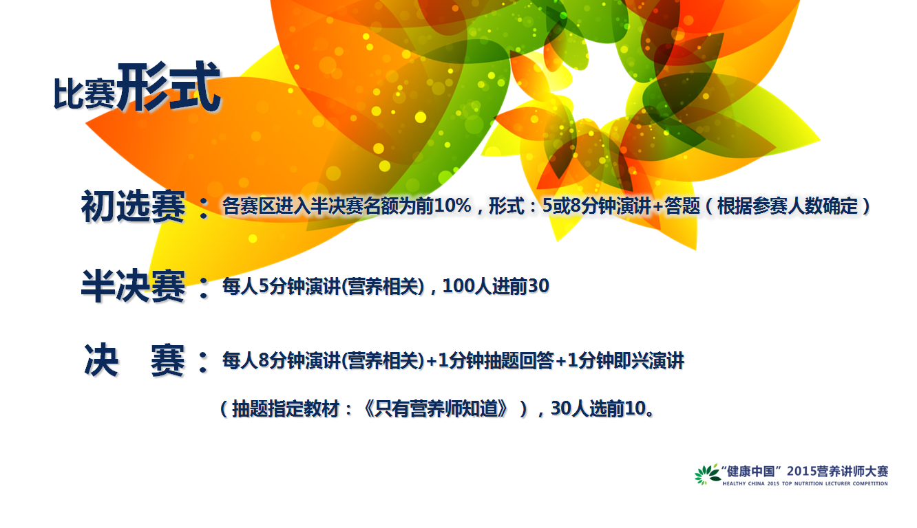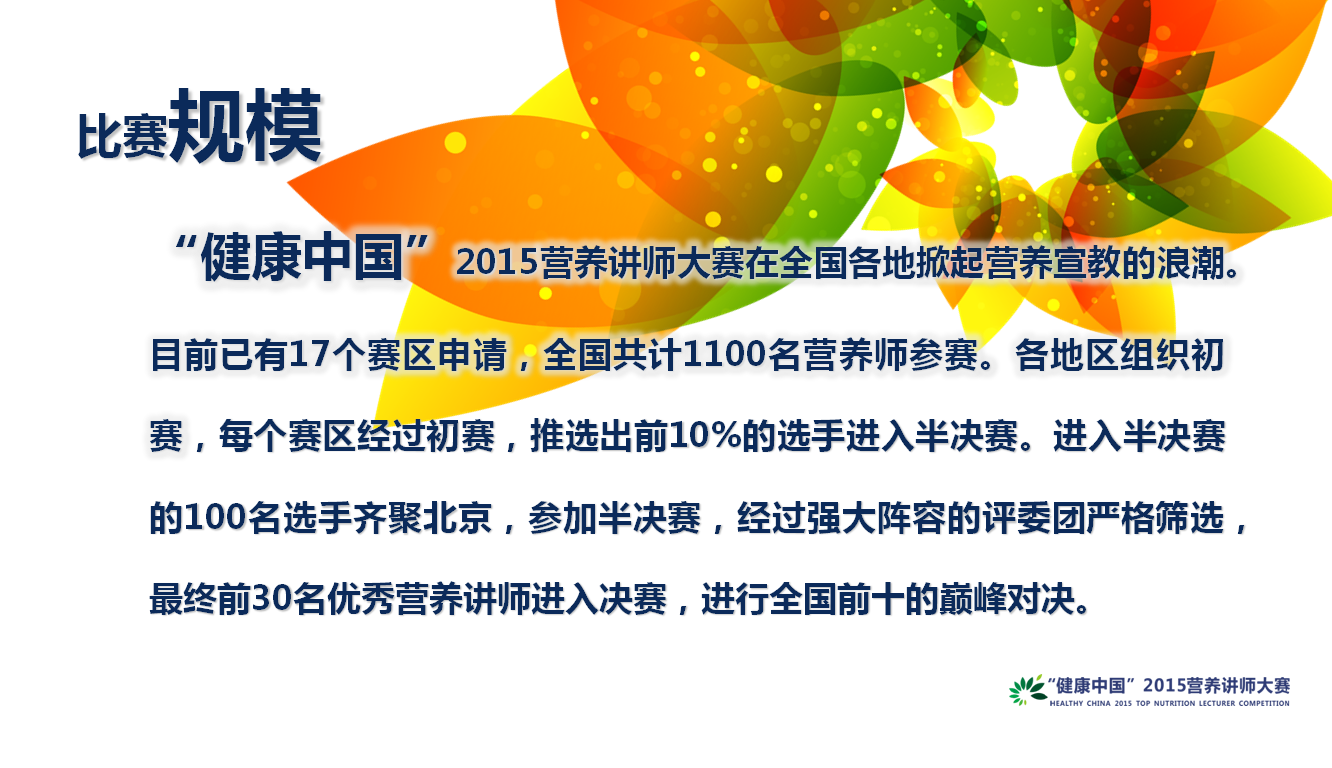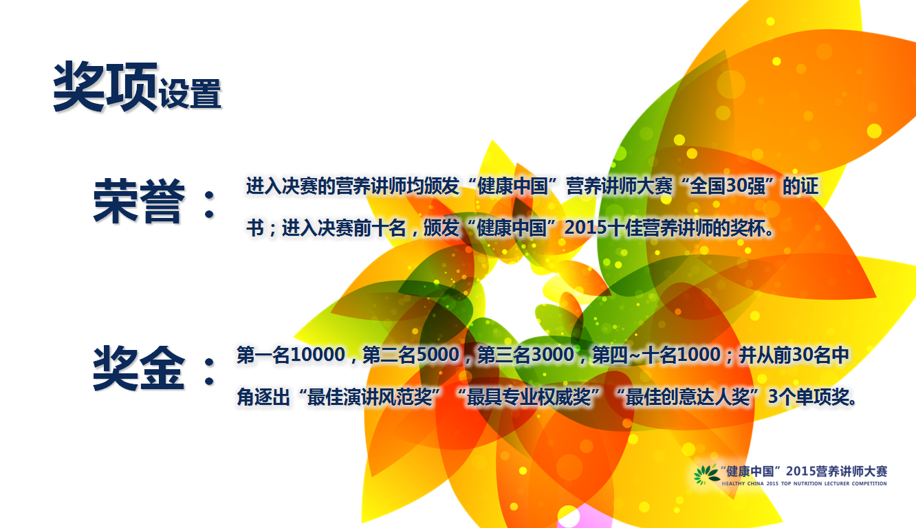 为了提升营养讲师培养的整体水平,为社会提供高质量的健康教育人才,更好地传播科学规范的健康知识,由首都保健营养美食学会、北京营养师俱乐部联合主办,赛福凯瑞医学研究院承办,自然之宝独家冠名的“健康中国”2015营养讲师大赛正式举办。努力通过大赛的形式,搭建一个营养讲师的展示平台,引领营养讲师成长,打造出一批又一批经得起检验的健康教育明星,开展高质量关注居民健康的讲座活动!