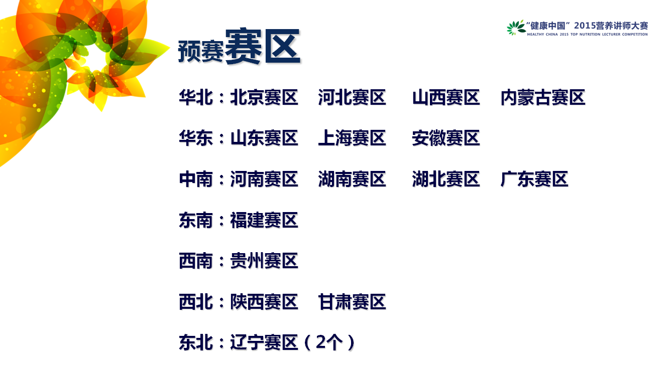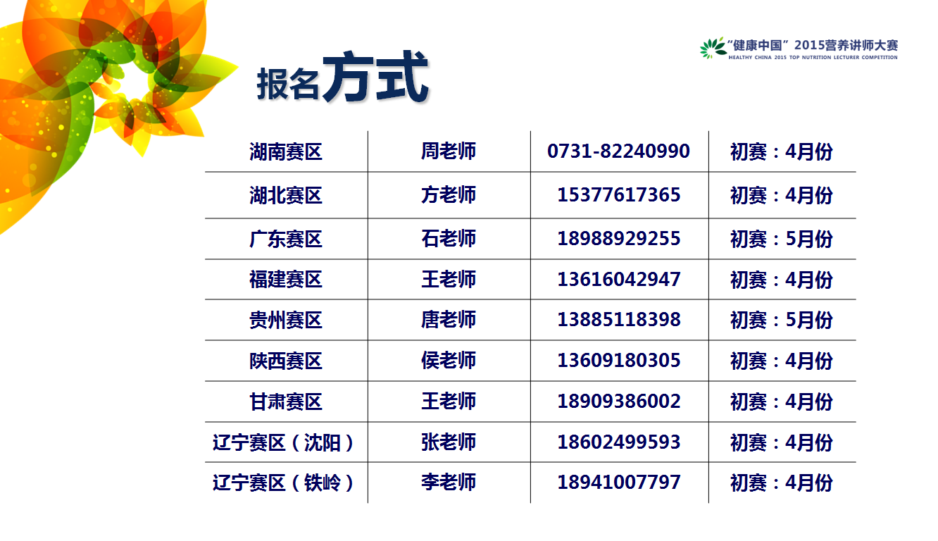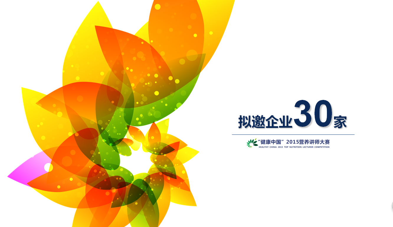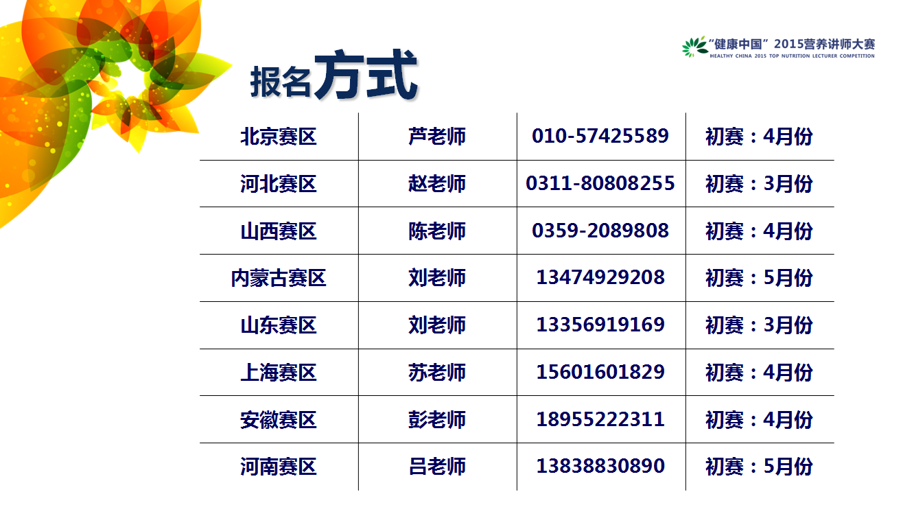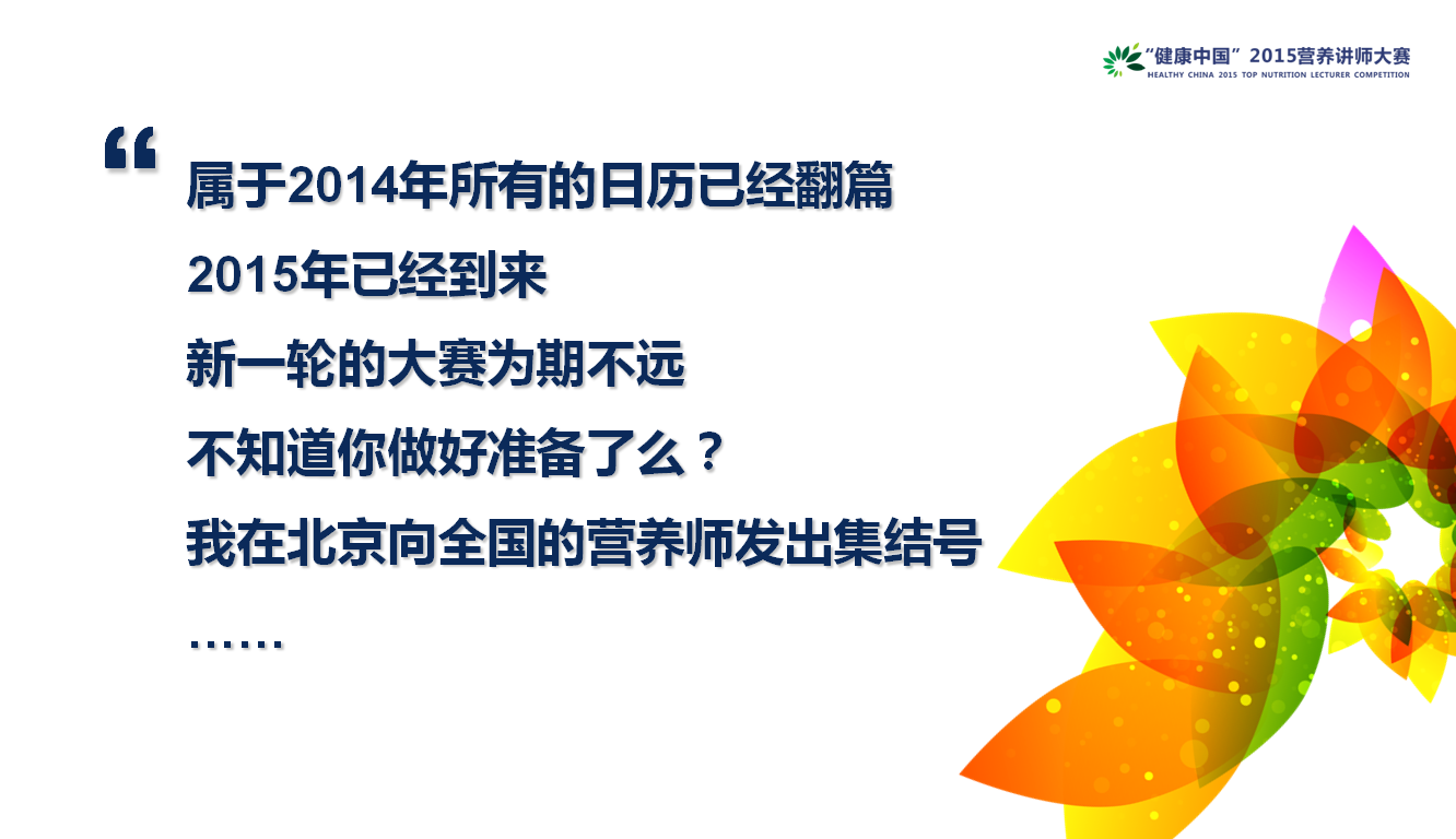 为了提升营养讲师培养的整体水平,为社会提供高质量的健康教育人才,更好地传播科学规范的健康知识,由首都保健营养美食学会、北京营养师俱乐部联合主办,赛福凯瑞医学研究院承办,自然之宝独家冠名的“健康中国”2015营养讲师大赛正式举办。努力通过大赛的形式,搭建一个营养讲师的展示平台,引领营养讲师成长,打造出一批又一批经得起检验的健康教育明星,开展高质量关注居民健康的讲座活动!