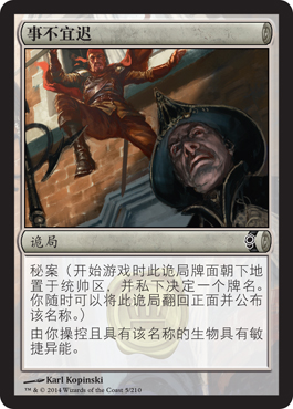 这些诡局要求你在比赛开始前私下决定一个牌名。通常最简单的方法是写在一张纸上,并将它和这张面朝下的诡局放在一起。但愿你能说出一个自己选到很多张的牌名。游戏中,每次你有优先权时,你可以将诡局牌翻回正面,并展示所决定的名称,以及该名称的牌将因此诡局牌获得何种好处。想像一下对手脸上会是何种表情:他发现了你的生物其实具有敏捷异能,或者...嗯,其他秘密异能。