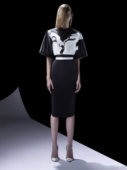 在 Mugler 2013 度假系列中,一件与纽约插画艺术家 Mel Odom 合作的黑色T 恤就给人们带来不小的冲击。宽大的上衣和袖口,修身简洁的高腰半身裙直抵膝盖,一根白色的束腰干练地系在腰间,点亮了全黑色的整体造型。T 恤上名为“歌舞伎之吻”的印花虽充满戏剧感,但流畅干净的线条与洗练的黑白灰配色却将图案完美地融入颇有极简主义意味的服饰里。印花那浓郁的东方韵味协同日本和服般的轮廓也为造型增加了一丝禅意。