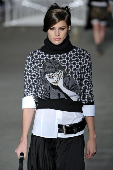 相比 Mugler 的戏剧性,由 Sophia Kokosalakiz 主刀设计的 Diesel Black Gold 2012 秋冬系列则更像是对“ 严肃时尚”的戏谑。此次走秀开门之作是一件像素化的毛衣,黑白格子映衬着一位女孩哭泣的模样。对于波普艺术的大胆应用和宽松男性化的廓形无疑展示了 Kokosalakiz 带着浓浓调侃味的幽默感。
