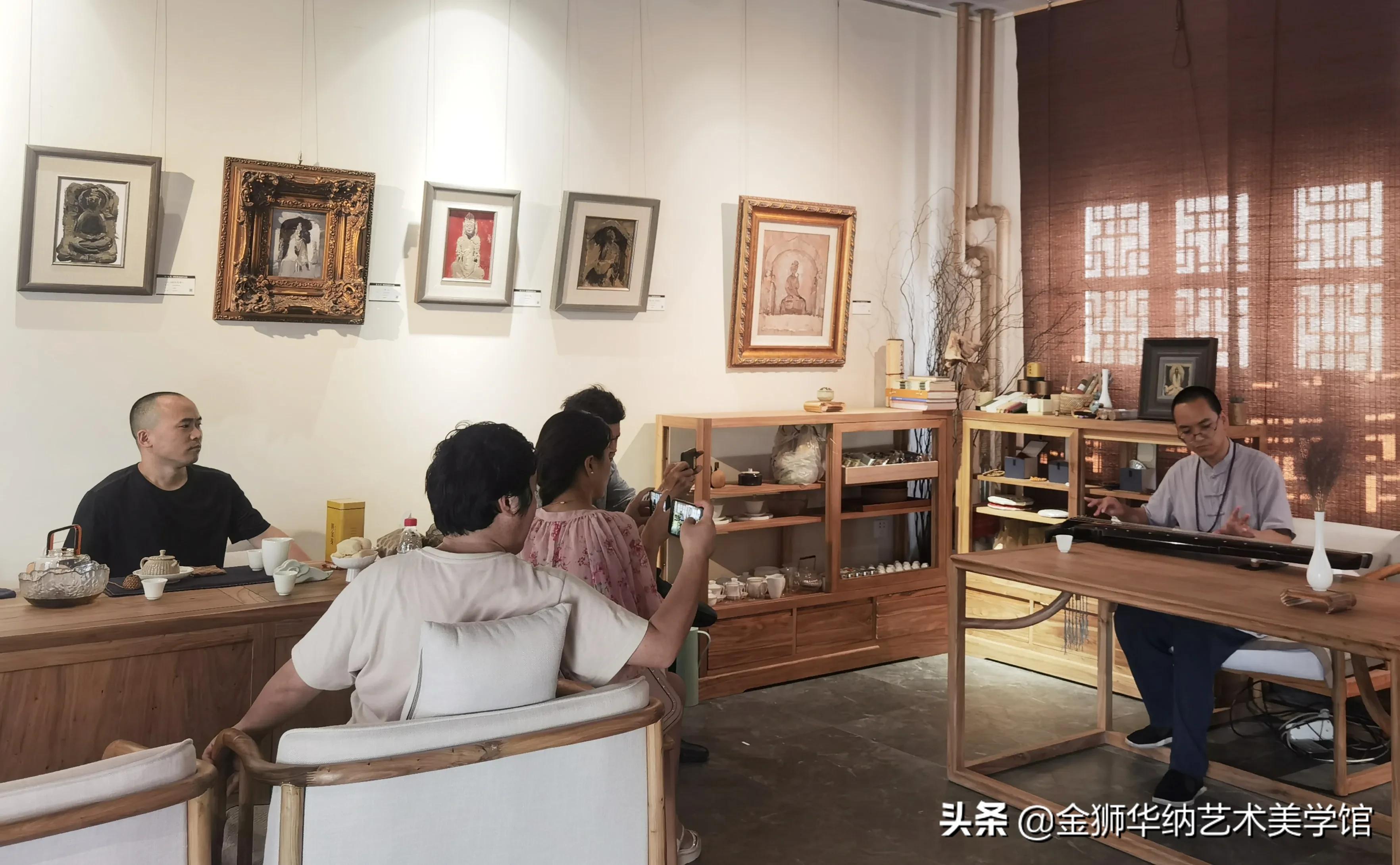 此时正值关中大地农忙时节,烈日炎炎,展厅内却清净凉爽,伴着悠悠古琴声,一幅幅作品呈现在观者眼前,此情此景缩短了时空的距离,一切如梦似幻,但却真实,庙宇建筑的辉煌,佛像的庄严肃穆,园林的曲径通幽与展厅内的佛造像油画交织辉映,构成一幅立体的可观的佛教艺术画卷。这里有佛经,有智慧,有艺术,有敬畏,还有难得的清净。