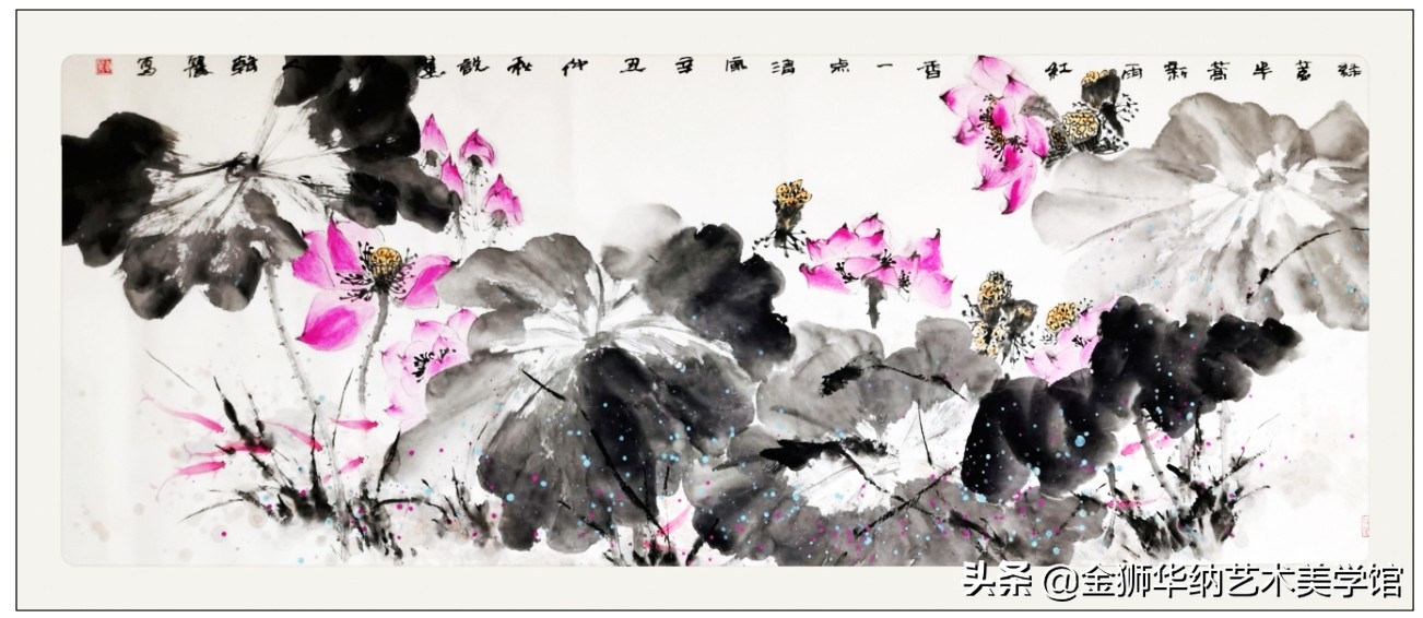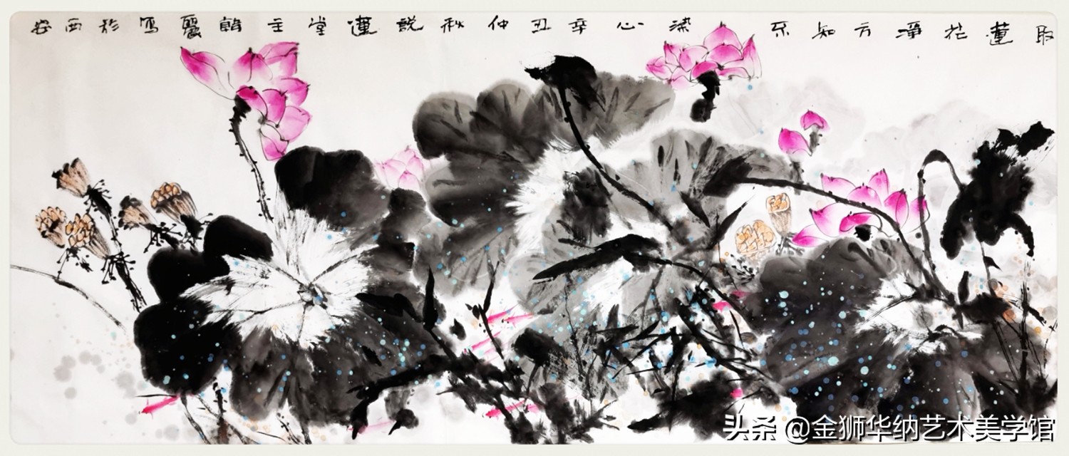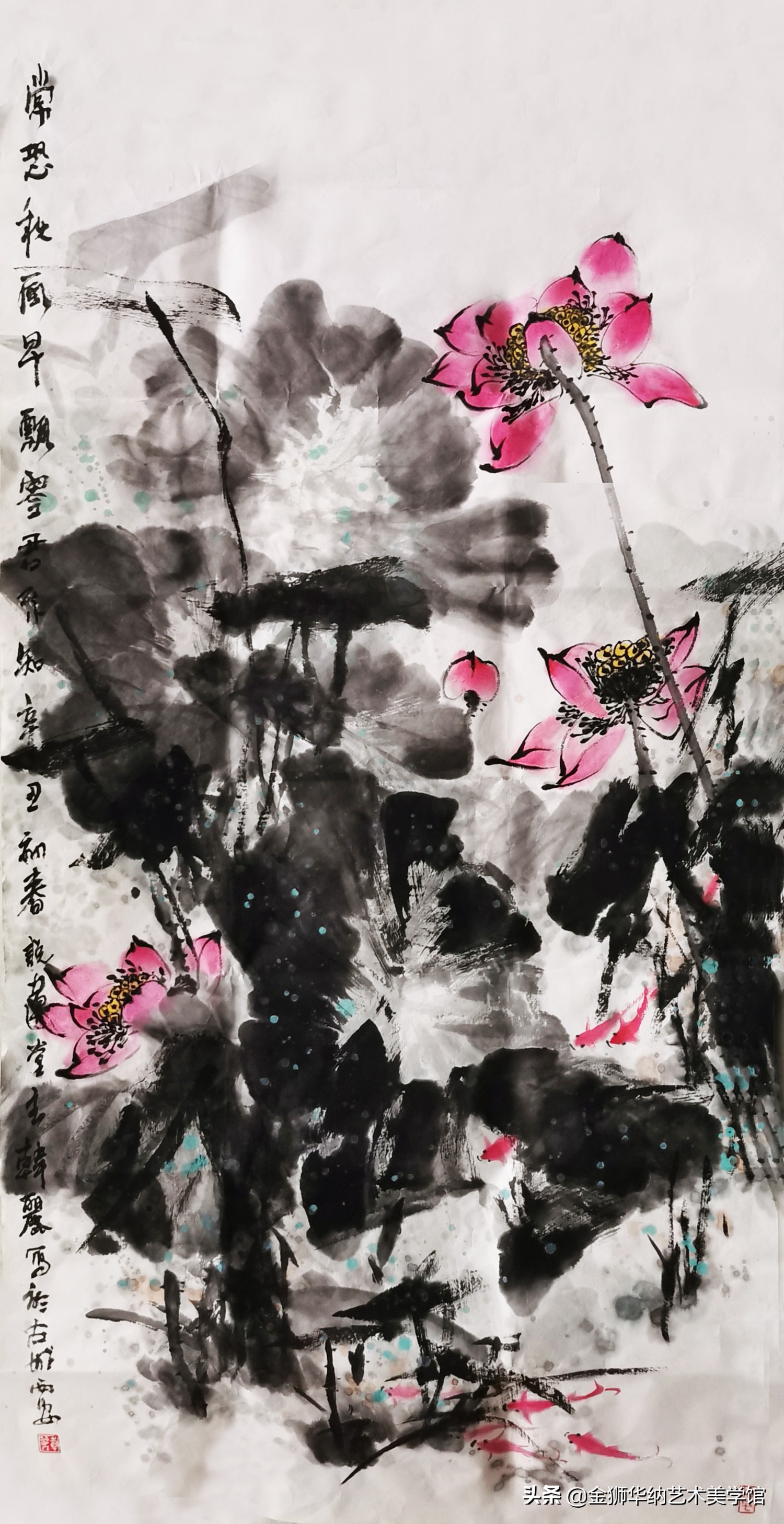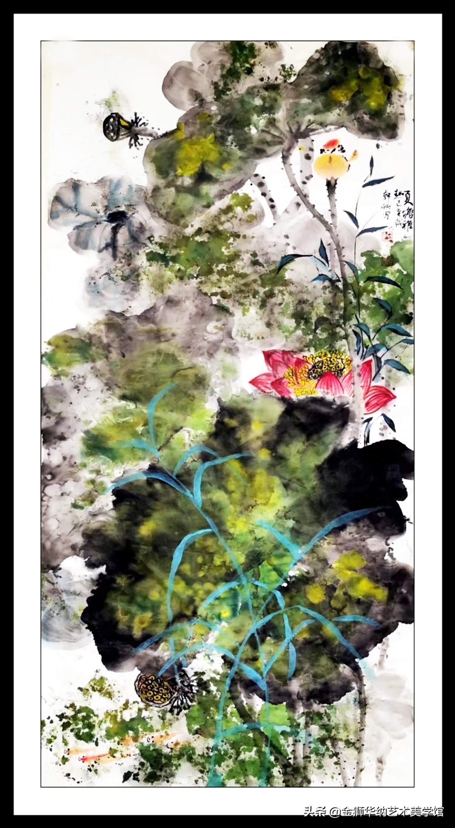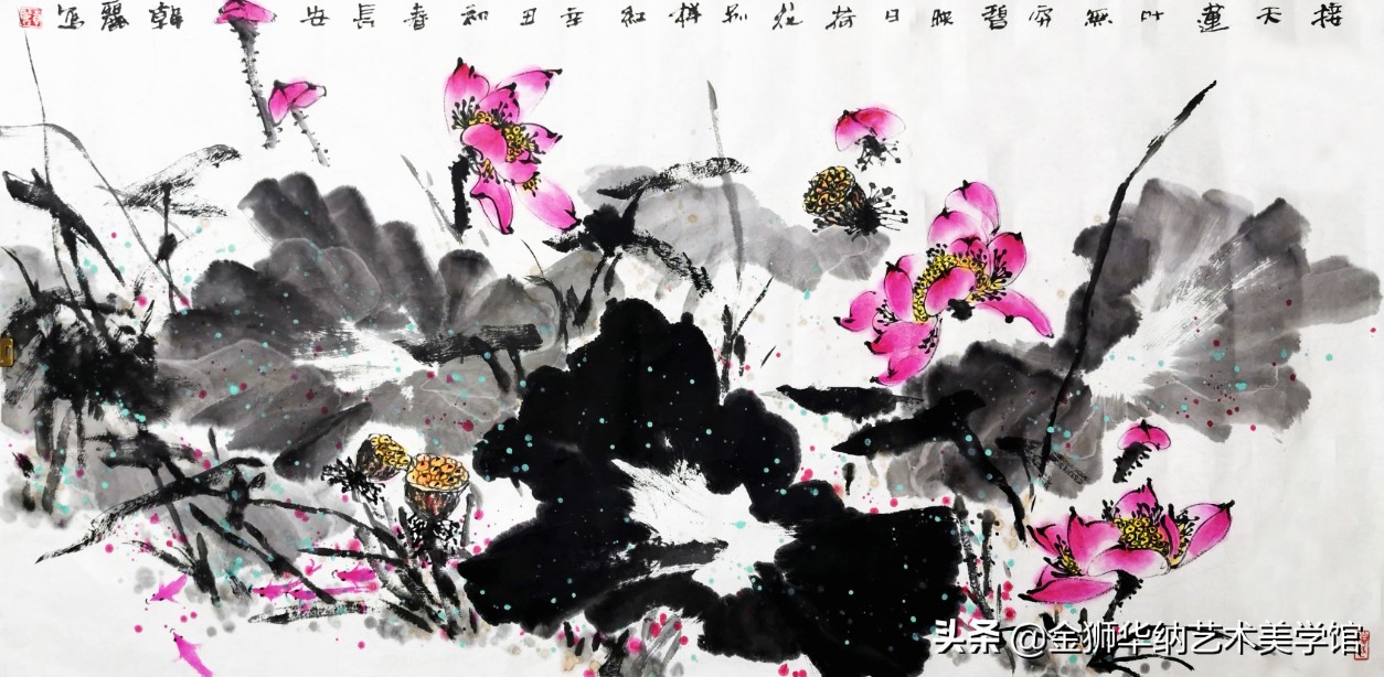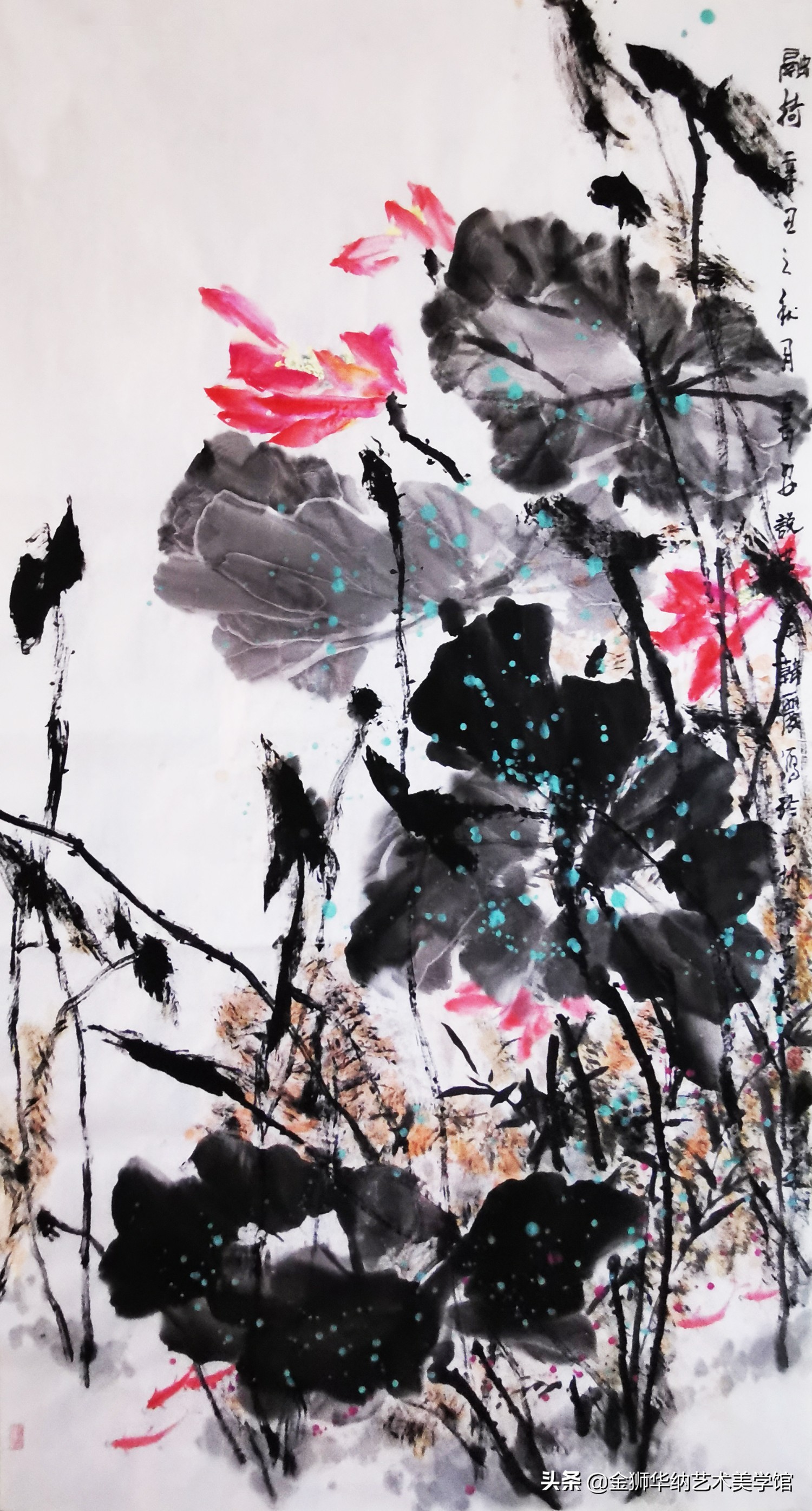 一支饱蘸浓墨的大笔洒向宣纸,画成浑厚荷叶,在斑驳的墨色中,让观者体会着生活的酸甜苦辣。不经意的几笔皴擦点染了一塘池水,清澈荡漾,无私无欲,洁净的使人流连忘返。秀一笔淡淡曙红描绘的荷花,让它高洁的志向,在不经意间飘向远方去净化大众的心灵。