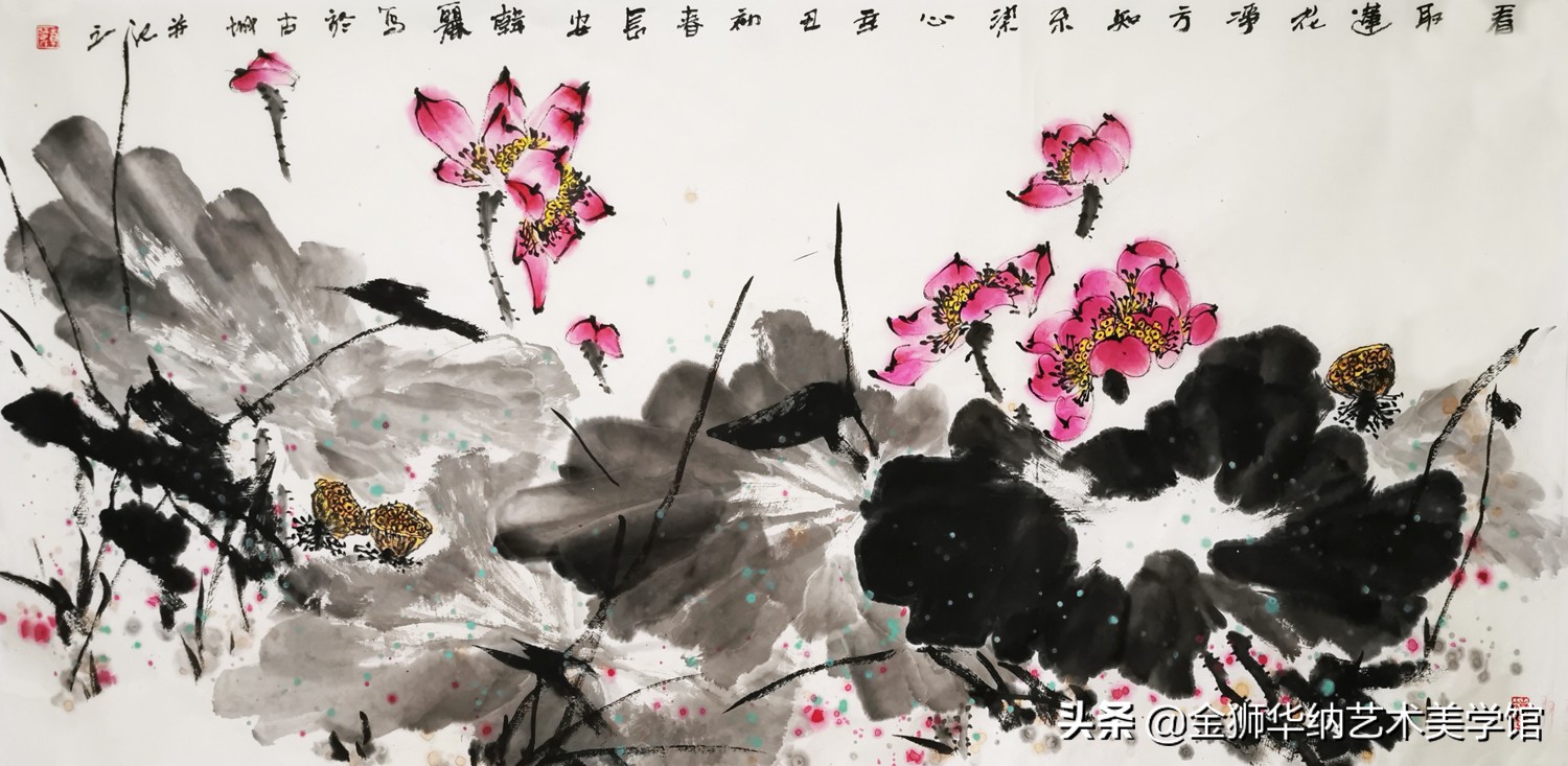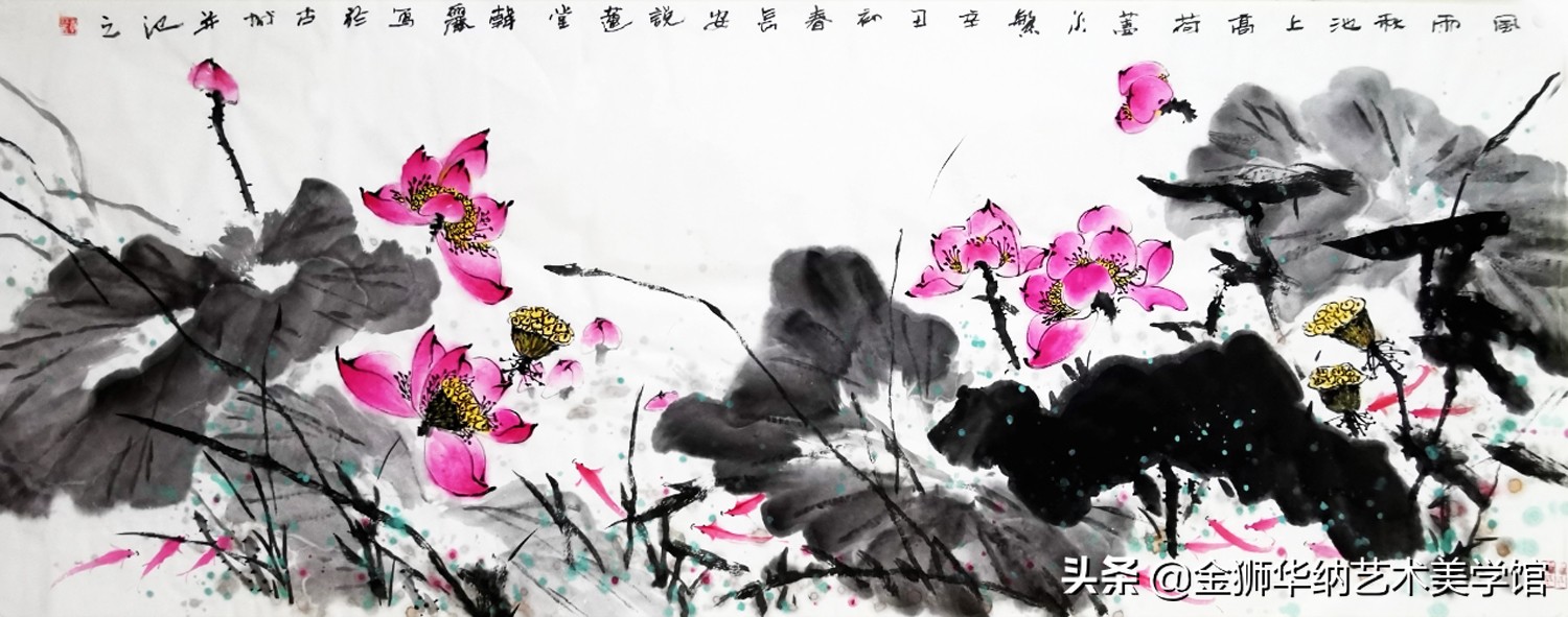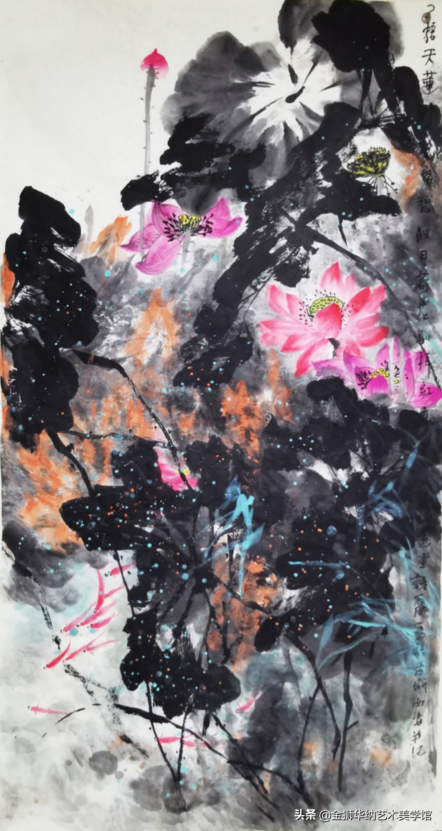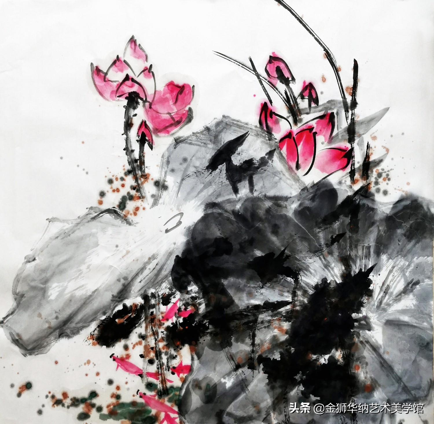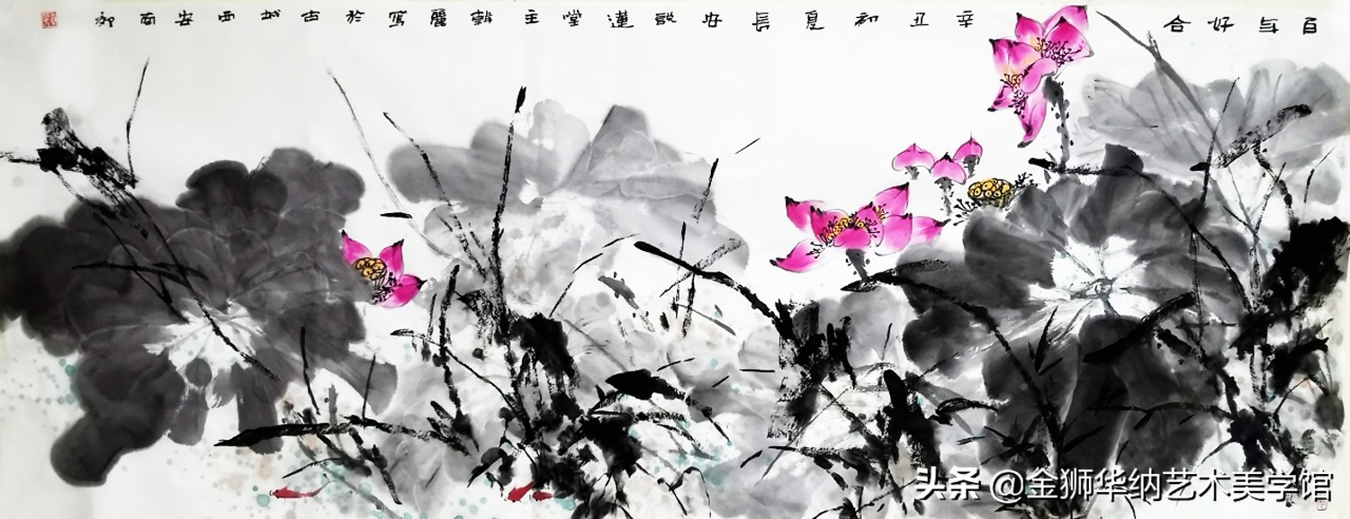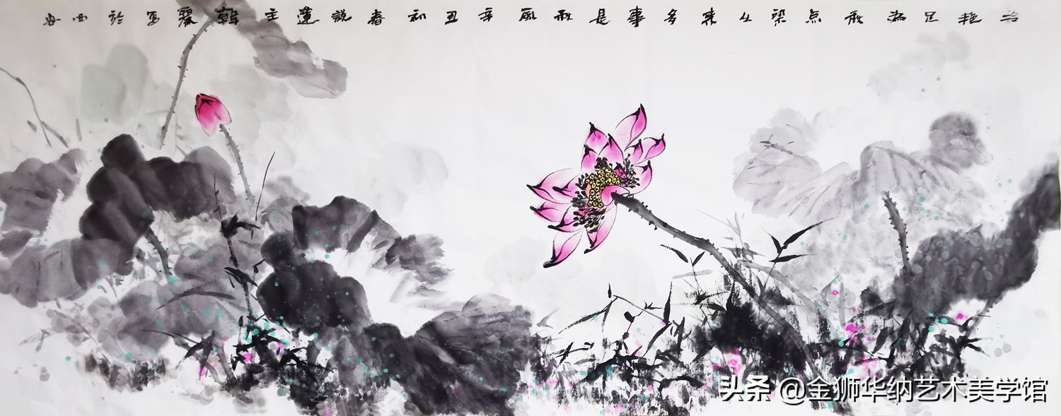 一支饱蘸浓墨的大笔洒向宣纸,画成浑厚荷叶,在斑驳的墨色中,让观者体会着生活的酸甜苦辣。不经意的几笔皴擦点染了一塘池水,清澈荡漾,无私无欲,洁净的使人流连忘返。秀一笔淡淡曙红描绘的荷花,让它高洁的志向,在不经意间飘向远方去净化大众的心灵。