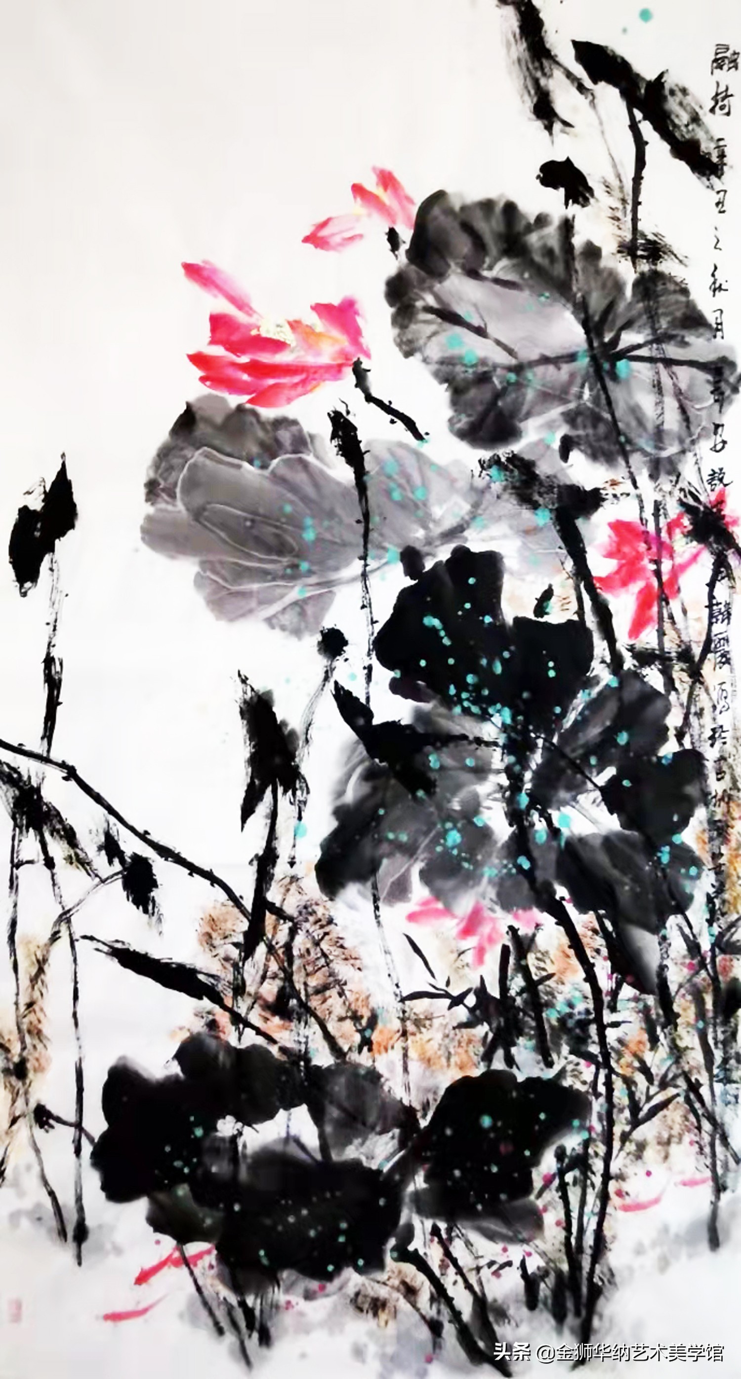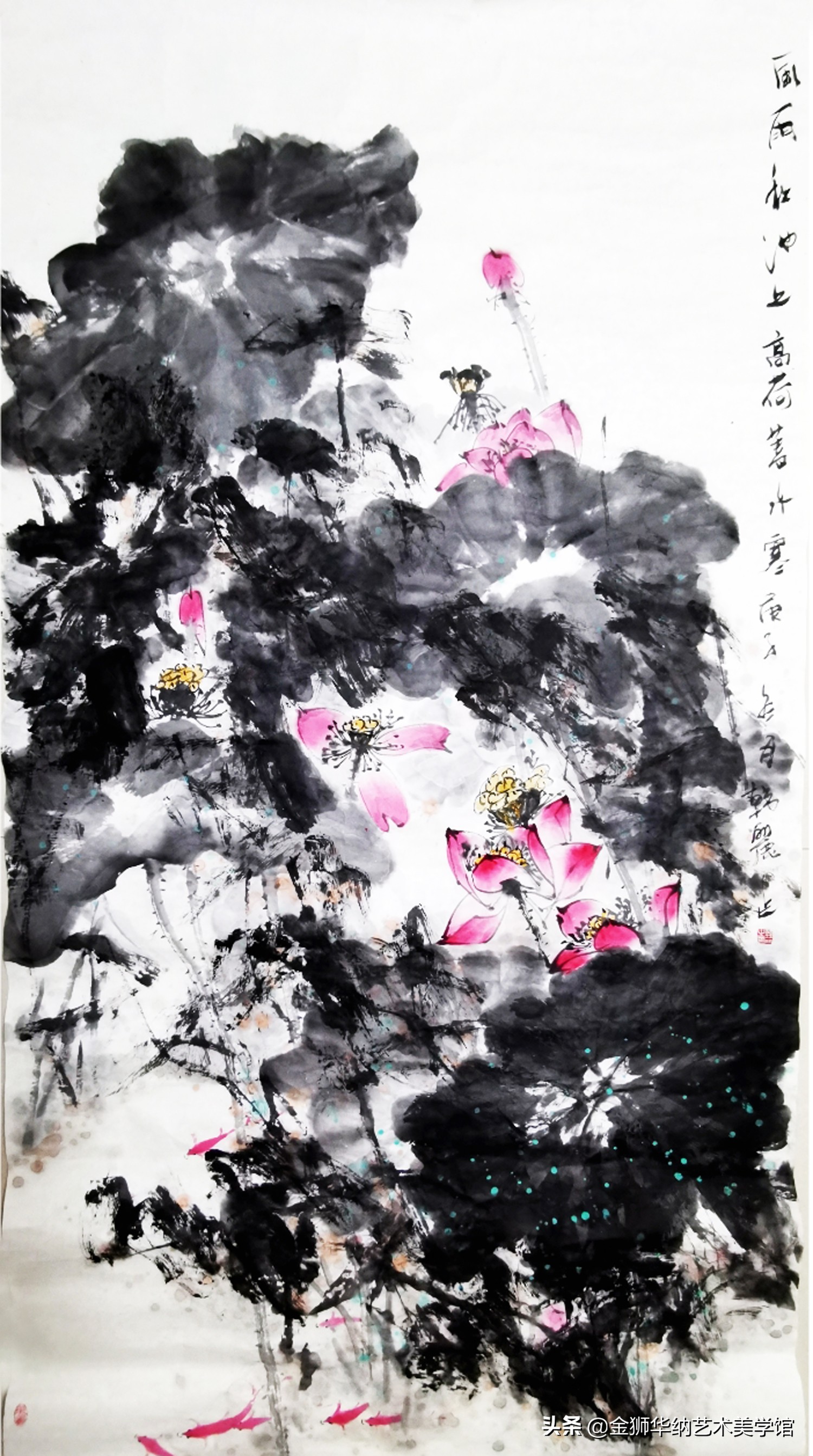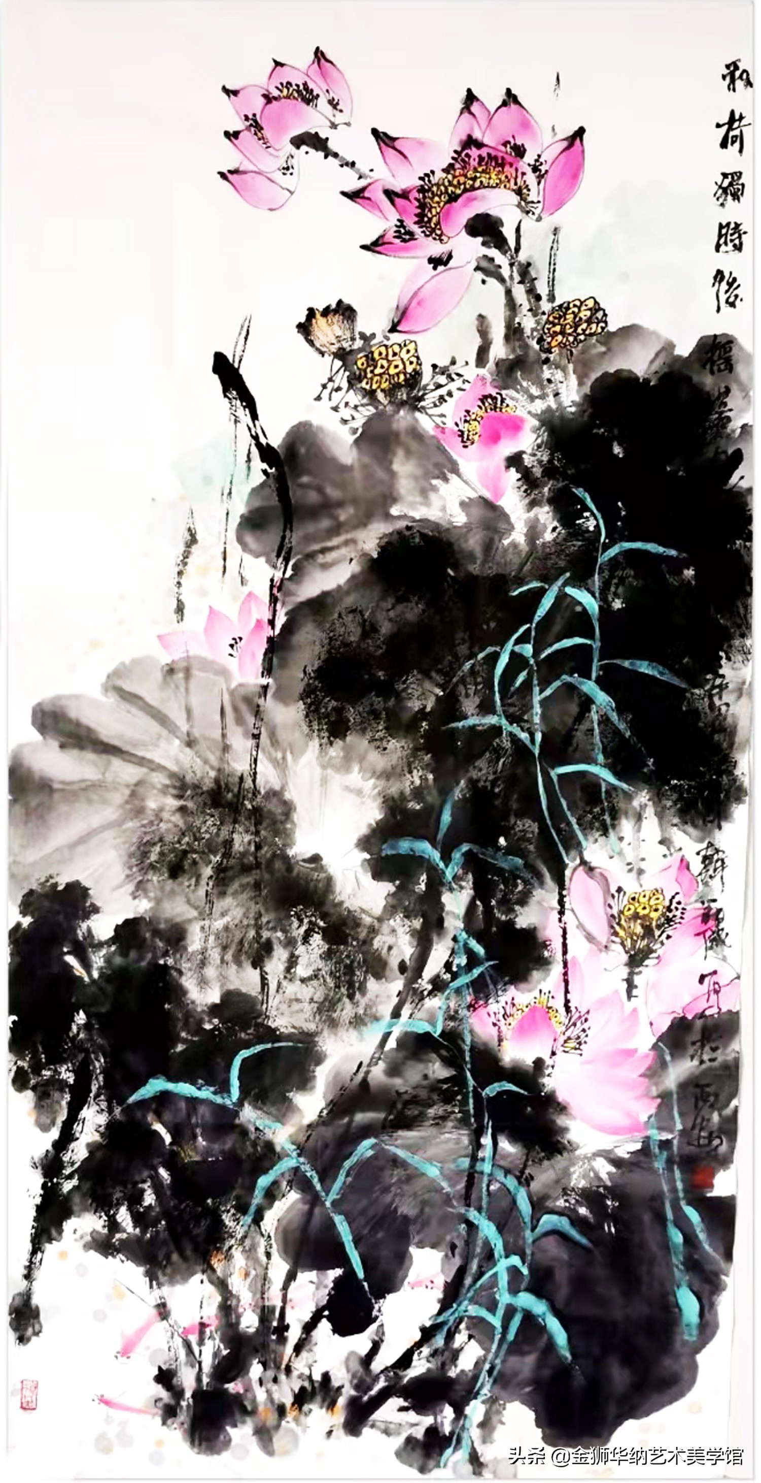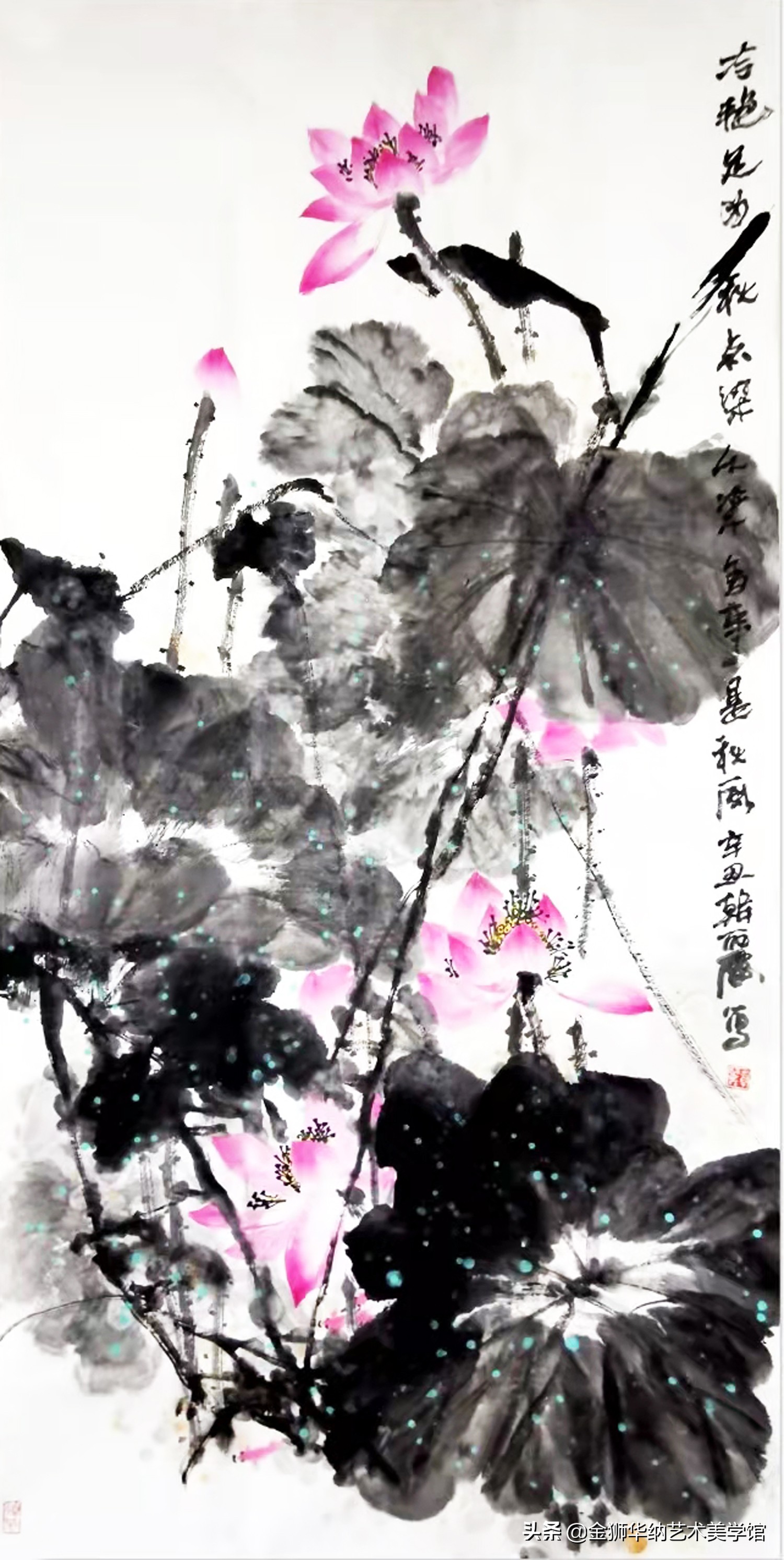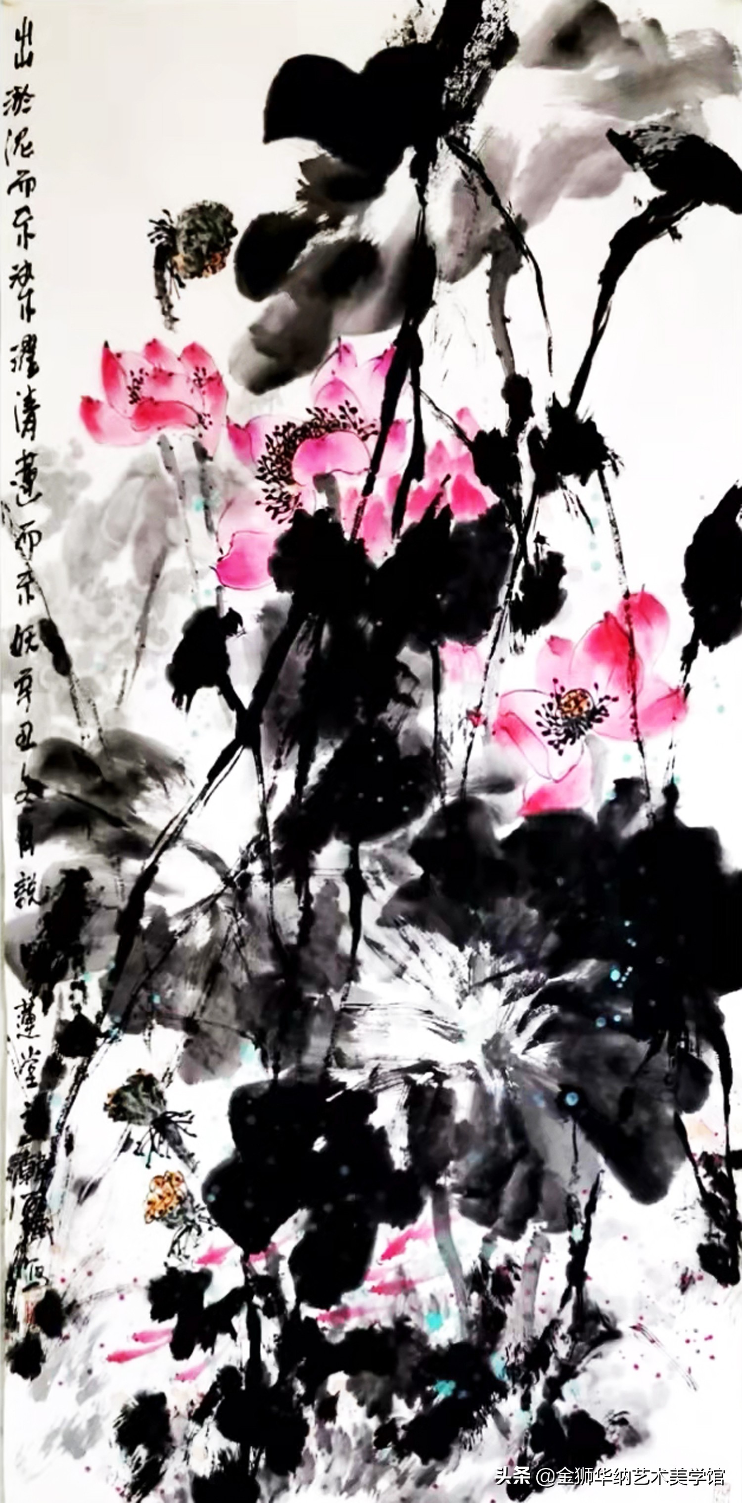 一支饱蘸浓墨的大笔洒向宣纸,画成浑厚荷叶,在斑驳的墨色中,让观者体会着生活的酸甜苦辣。不经意的几笔皴擦点染了一塘池水,清澈荡漾,无私无欲,洁净的使人流连忘返。秀一笔淡淡曙红描绘的荷花,让它高洁的志向,在不经意间飘向远方去净化大众的心灵。